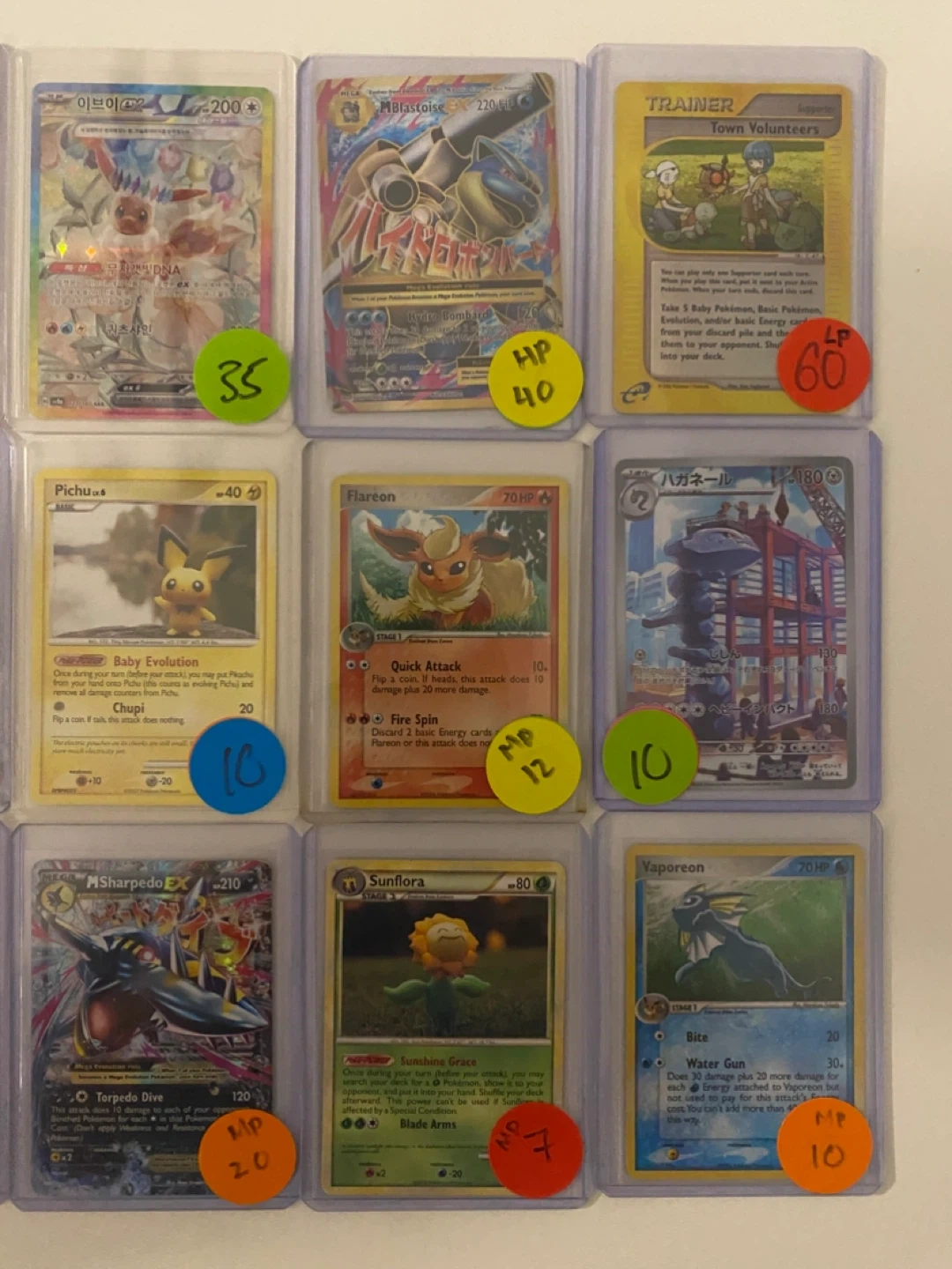 This is a collection of various Pokemon trading cards, featuring popular characters like Charizard GX and Blastoise. The cards are in protective sleeves and offer a range of HP and attack power. Great for collectors and players alike!