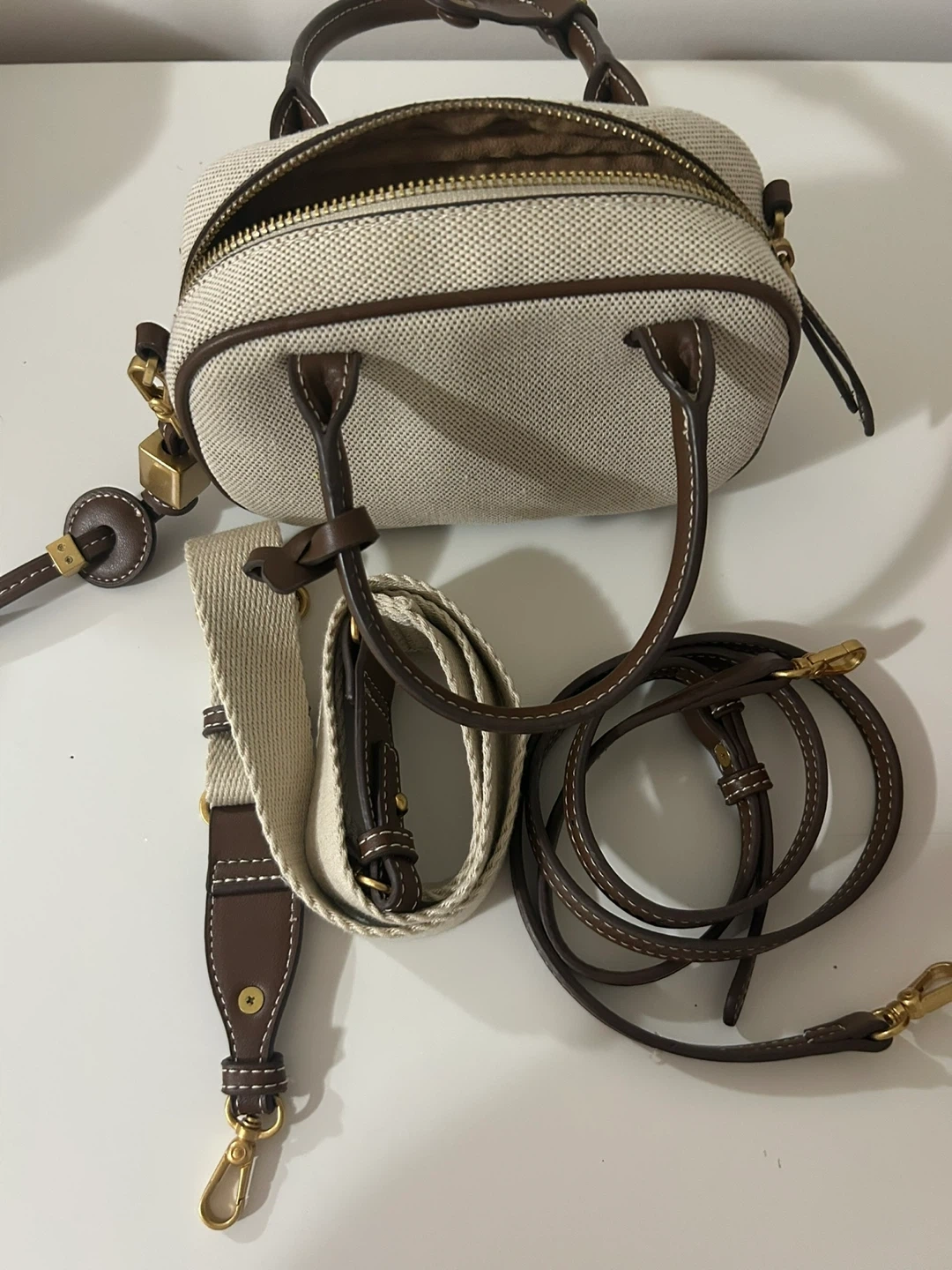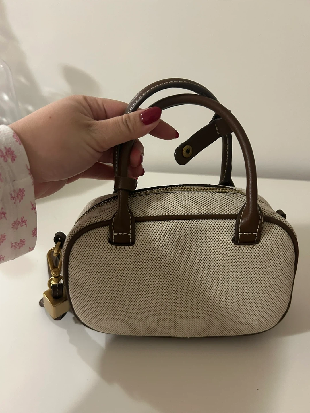 This cute mini duffle bag is made of textured canvas with leather trim and handles. It comes with a detachable crossbody strap and a top handle for versatile carrying options. Its compact size makes it great for quick errands or as a stylish accessory.