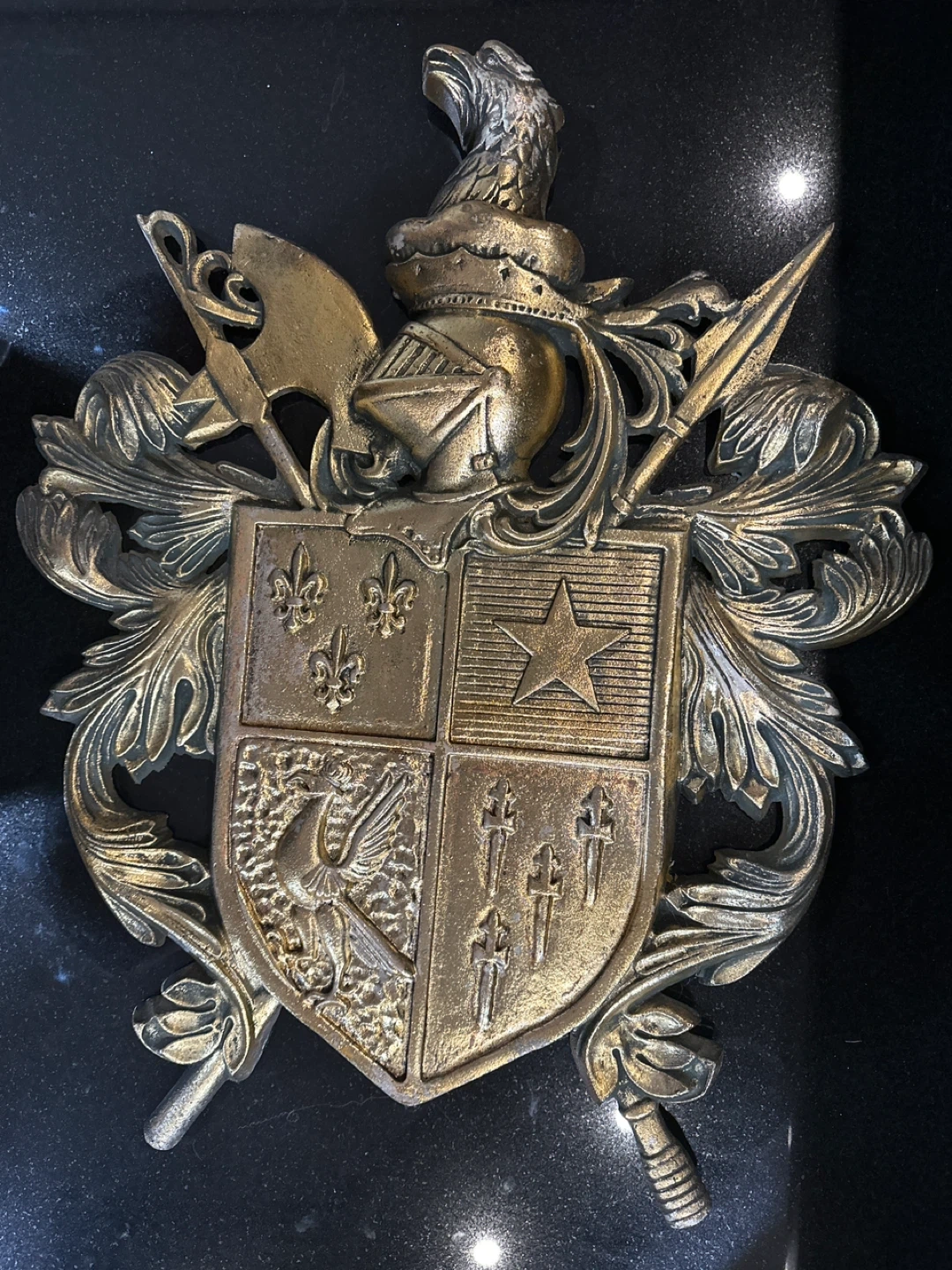 This is a vintage wall plaque featuring a detailed coat of arms. It's made of metal with a brass-like finish. The plaque includes an eagle, fleur-de-lis, a star, and other heraldic symbols. It's a substantial piece for wall decor.