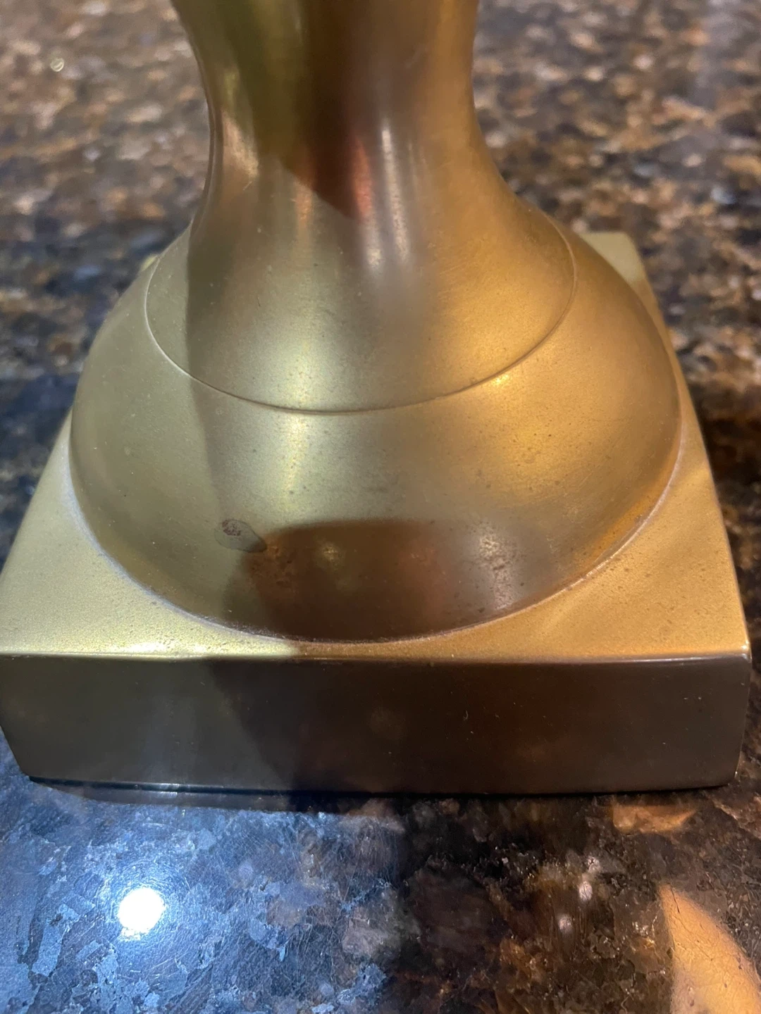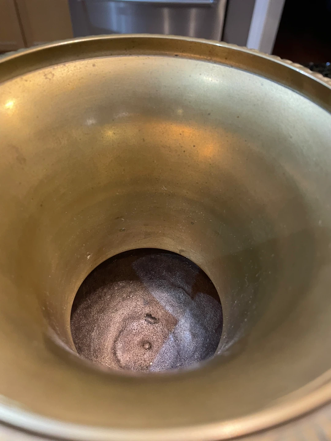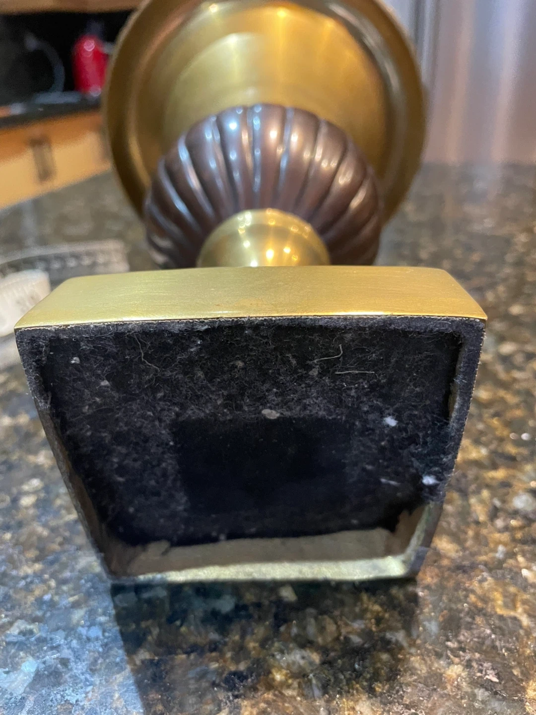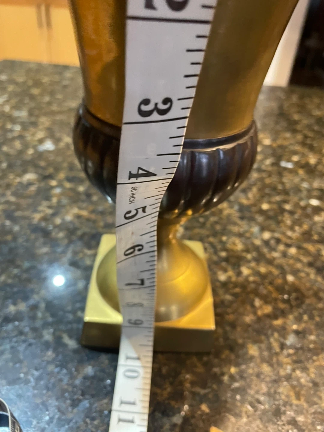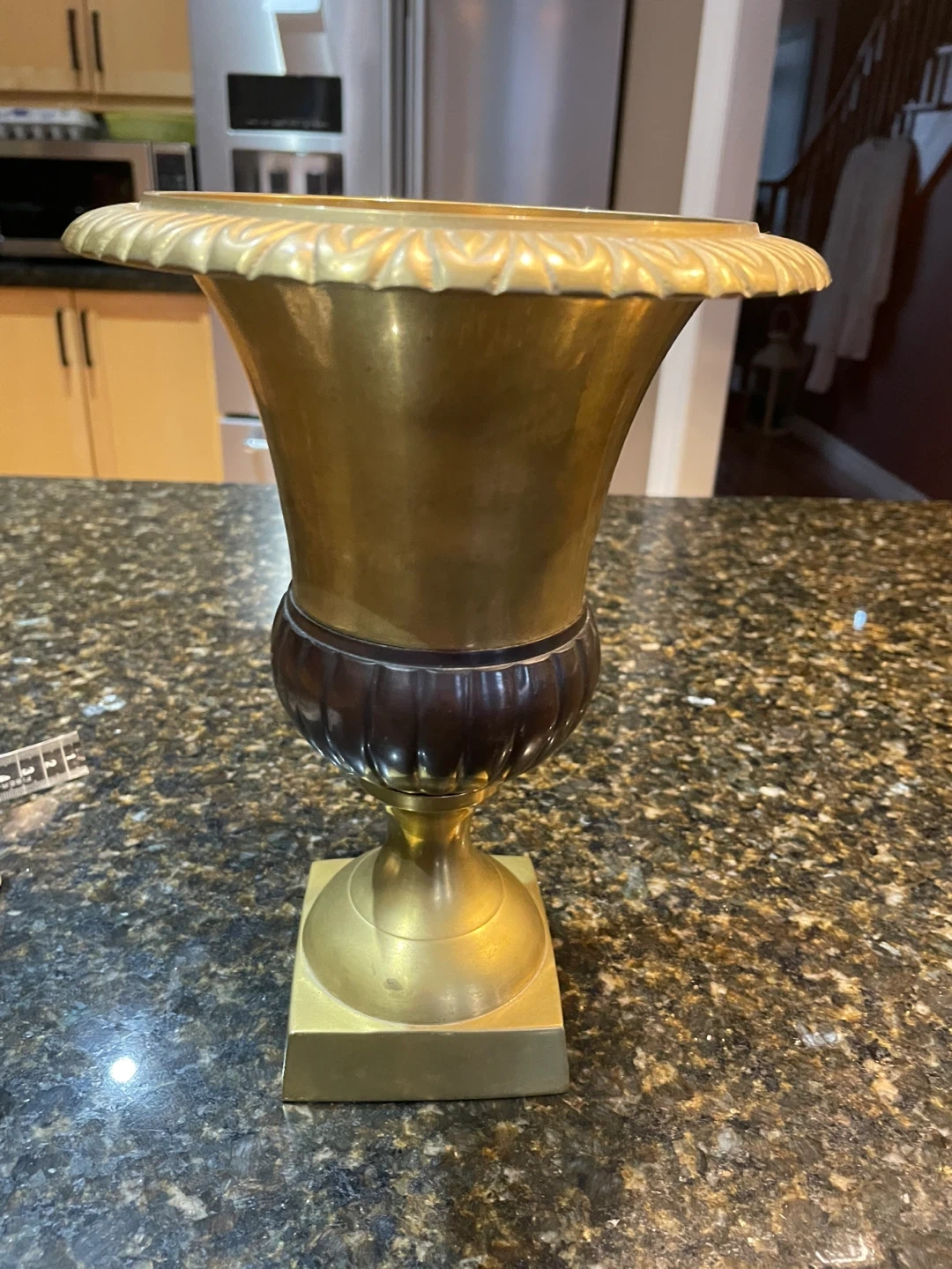 This is a decorative brass urn with a fluted dark brown section. It has a weighted brass base with felt lining. Its classic design makes it a handsome addition to any home.