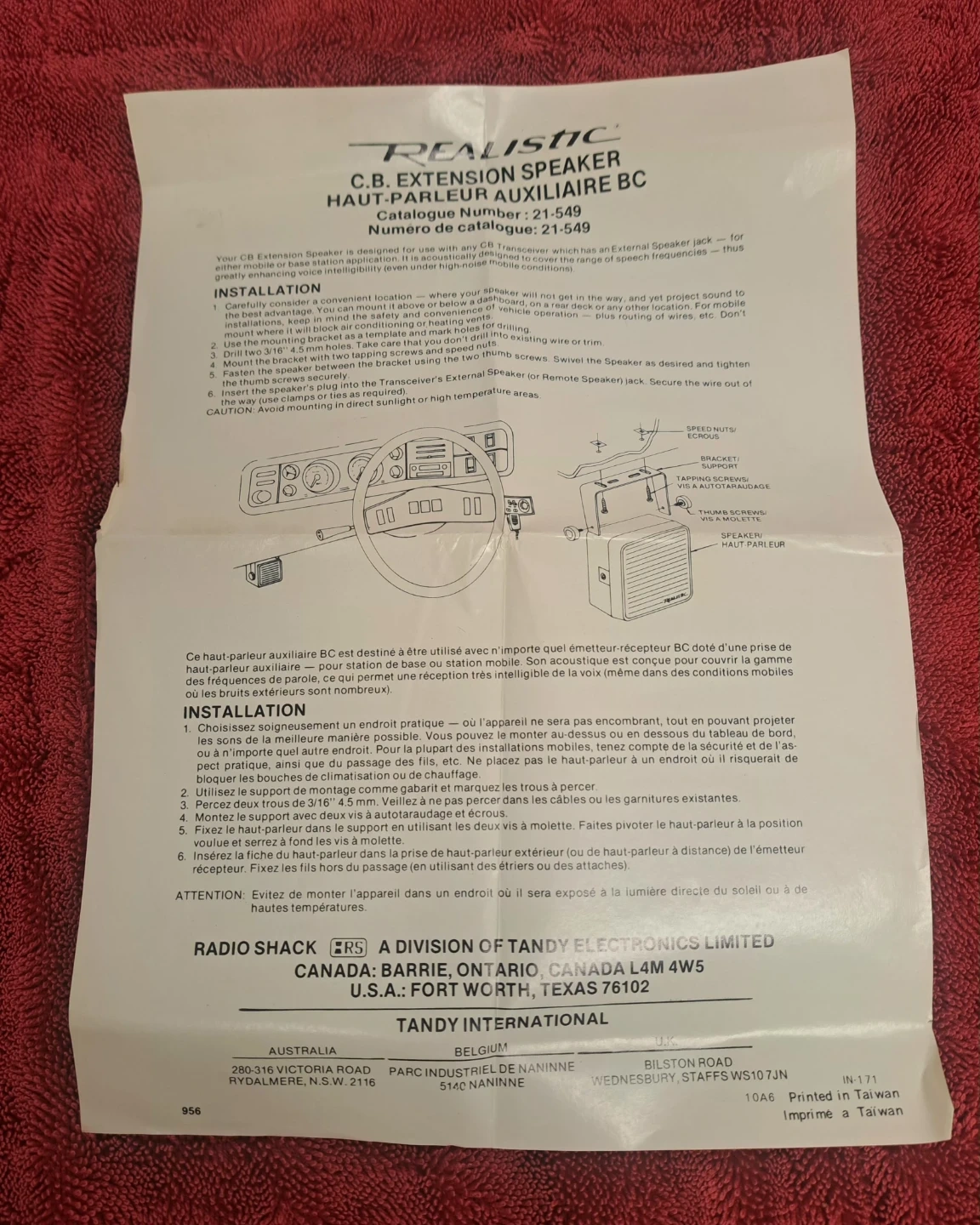 This Realistic extension speaker is designed for CBs and scanners. It Includes speaker, mounting bracket, and hardware and the original box. Ideal for mobile or base station use.