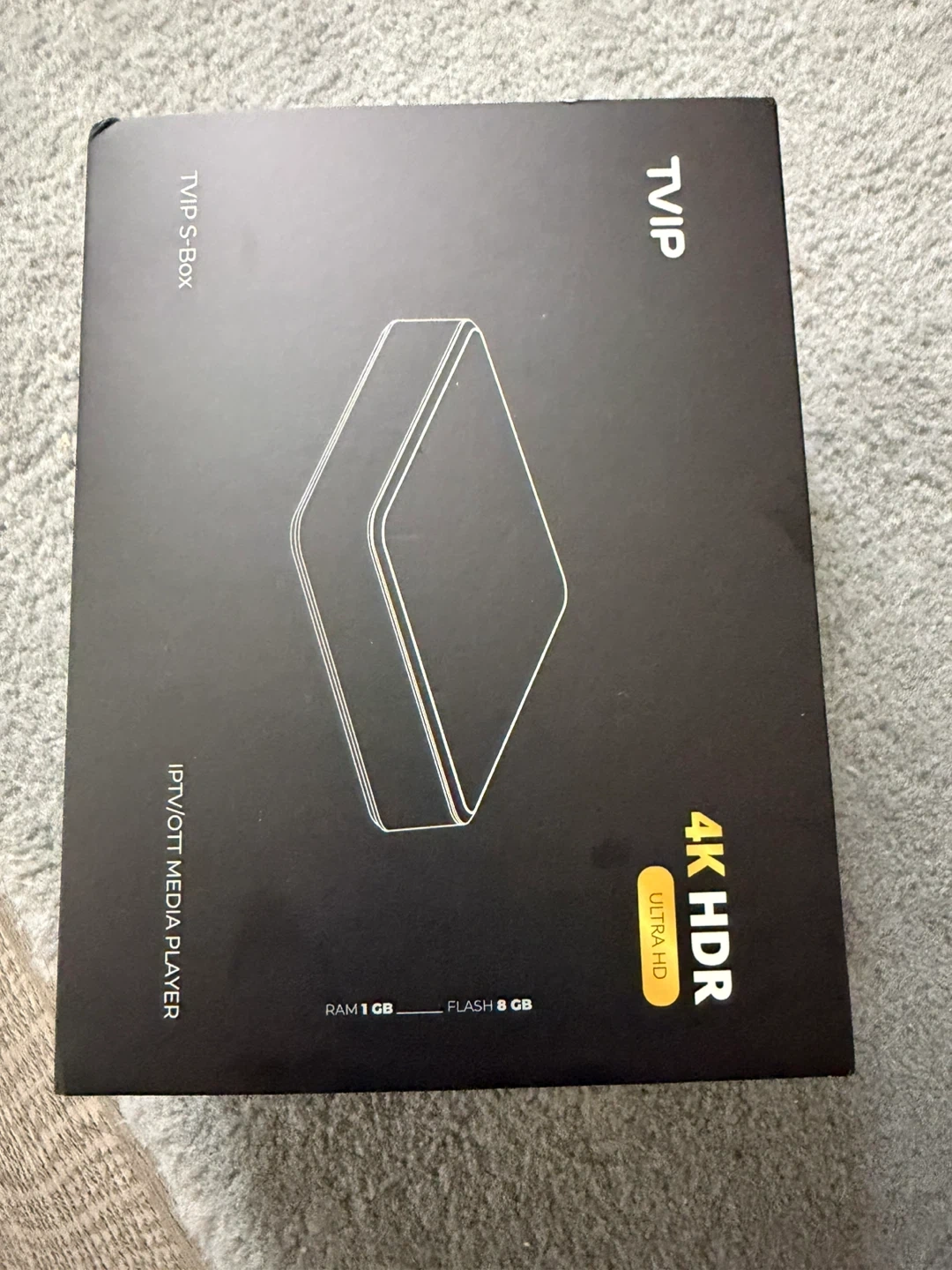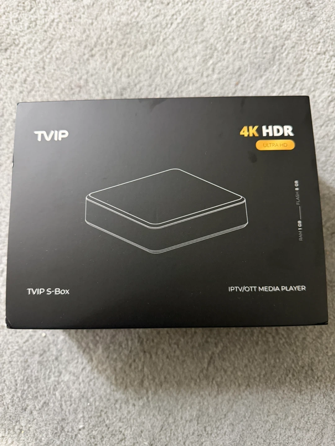 Selling a brand new TVIP S-Box IPTV/OTT media player. its original box and has never been used! It supports 4K HDR Ultra HD. The box includes the media player, remote control, power adapter, and HDMI cable. It has 1 GB of RAM and 8 GB of flash memory.