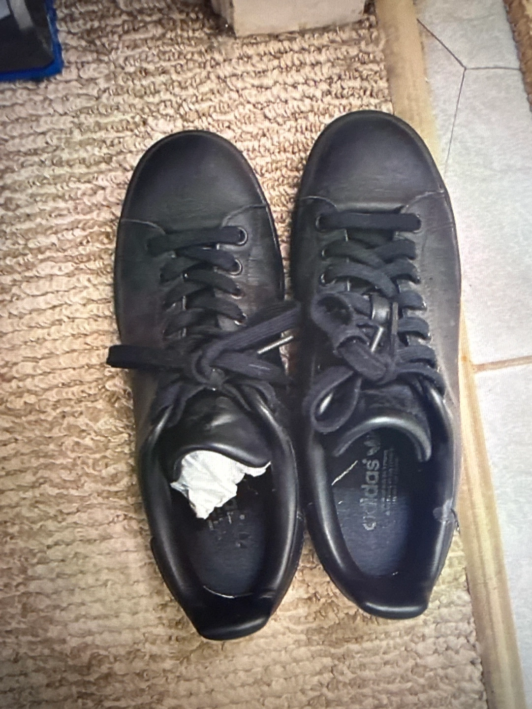 Pair of black leather Adidas sneakers. Lace-up closure. Men's size 7. Pre-owned.