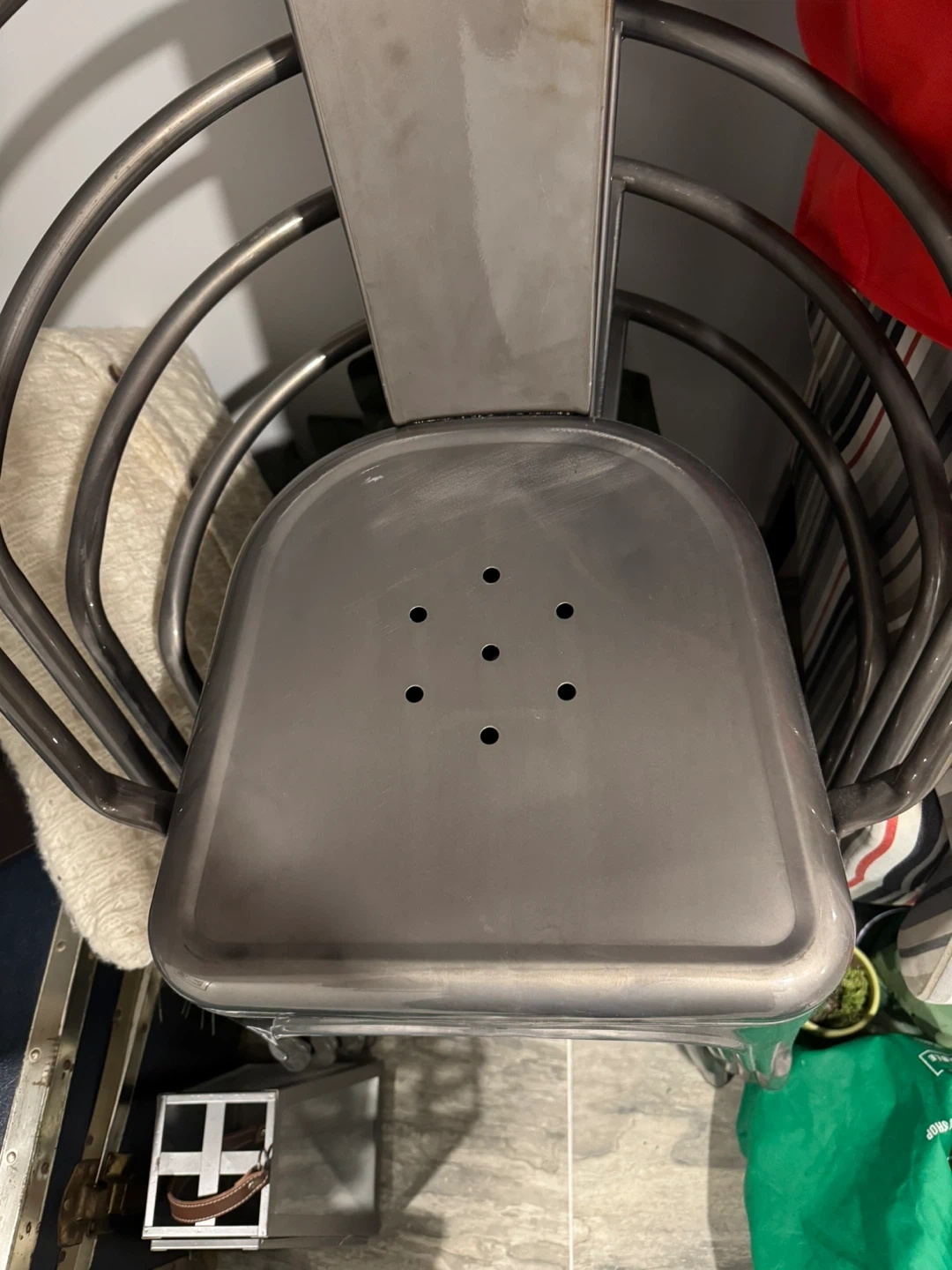 Stackable metal chair with a brushed nickel finish. This industrial-style chair has a curved back and a seat with drainage holes. It's suitable for indoor or outdoor use. In excellent condition.