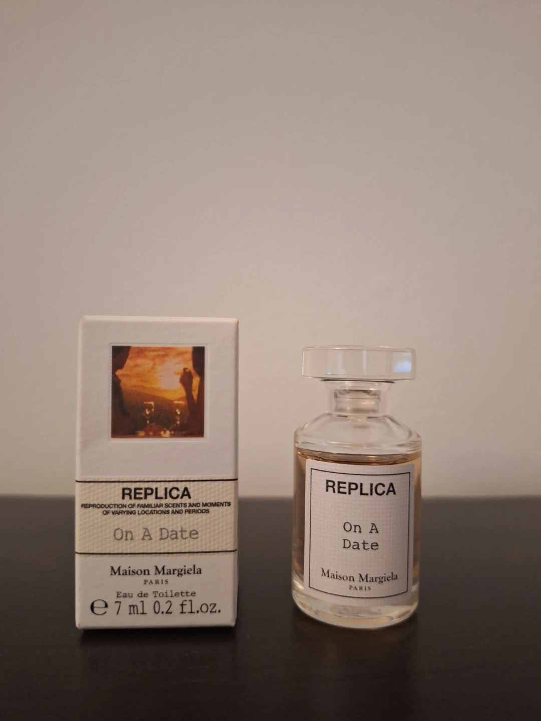 Maison Margiela Replica On A Date Eau de Toilette. Includes original box and 7 ml bottle. This fragrance is a reproduction of familiar scents and moments.