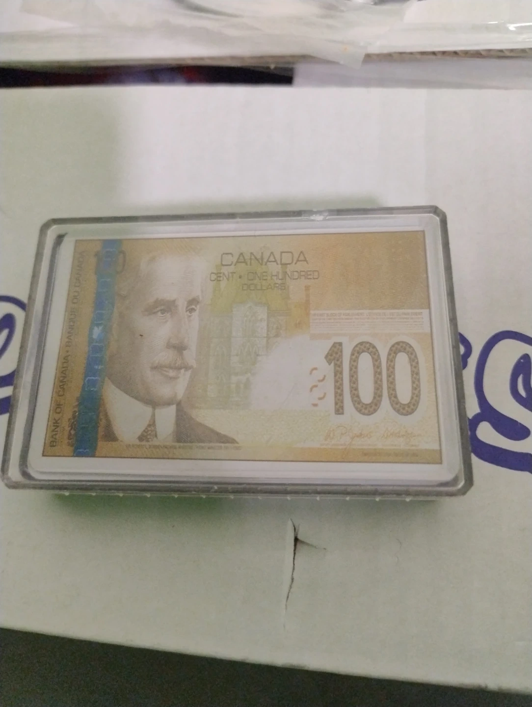 Deck of playing cards featuring a Canadian $100 bank note design on the back. Includes a full deck of cards with standard playing card faces. Great for card games or as a unique collector's item!