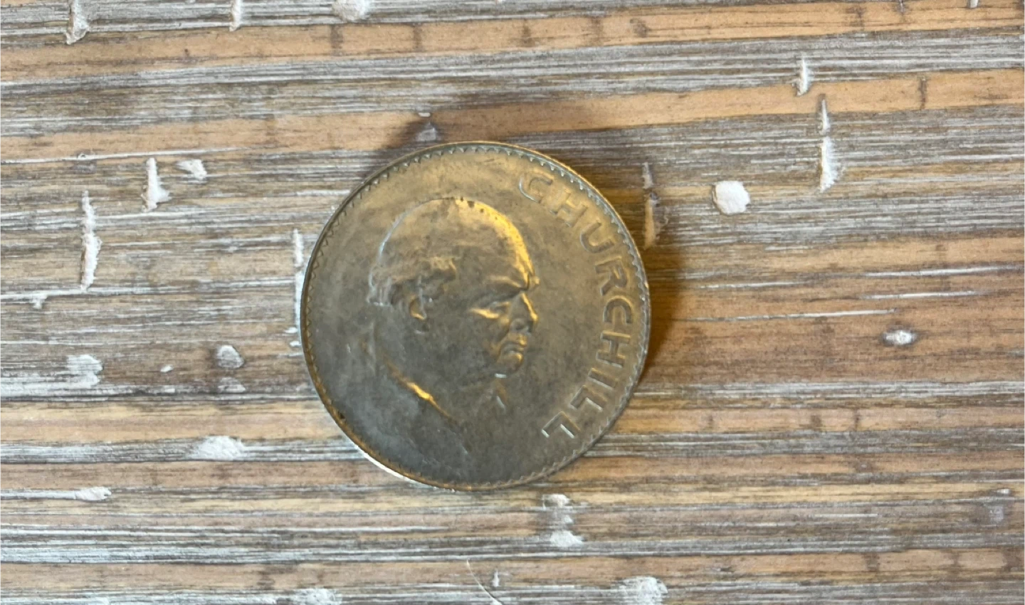 One 1965 coin featuring Queen Elizabeth II on one side and Winston Churchill on the other. It's a British coin from that year.