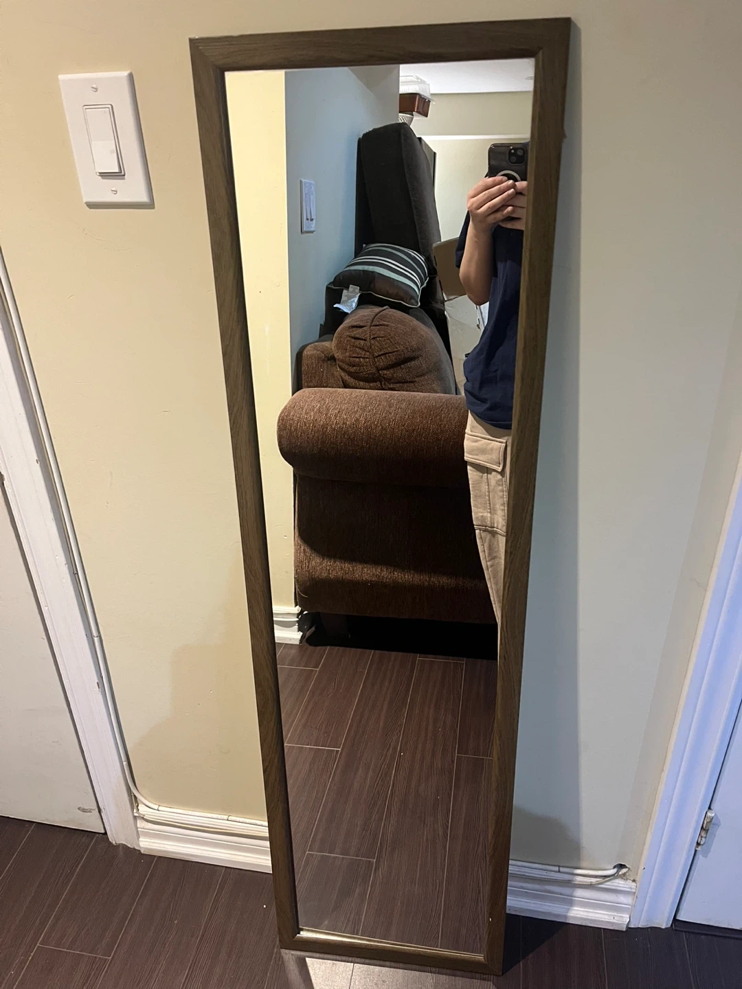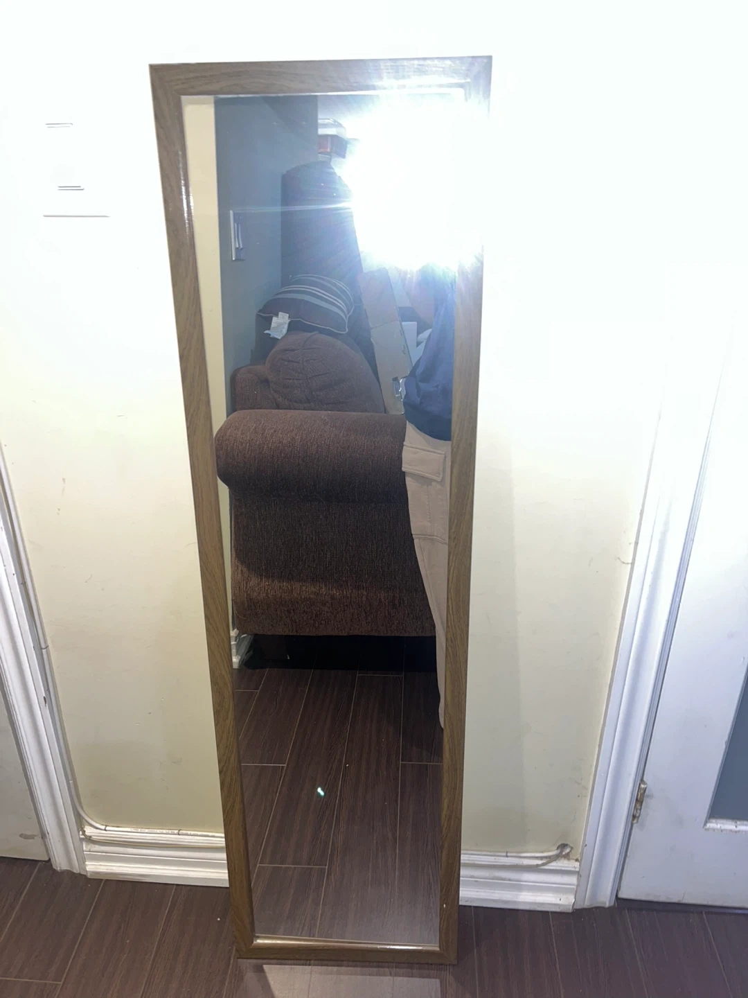 Selling a full-length mirror with a brown frame! It's in great condition and ready to brighten up your space. It's perfect for checking out your outfit or adding a touch of elegance to any room