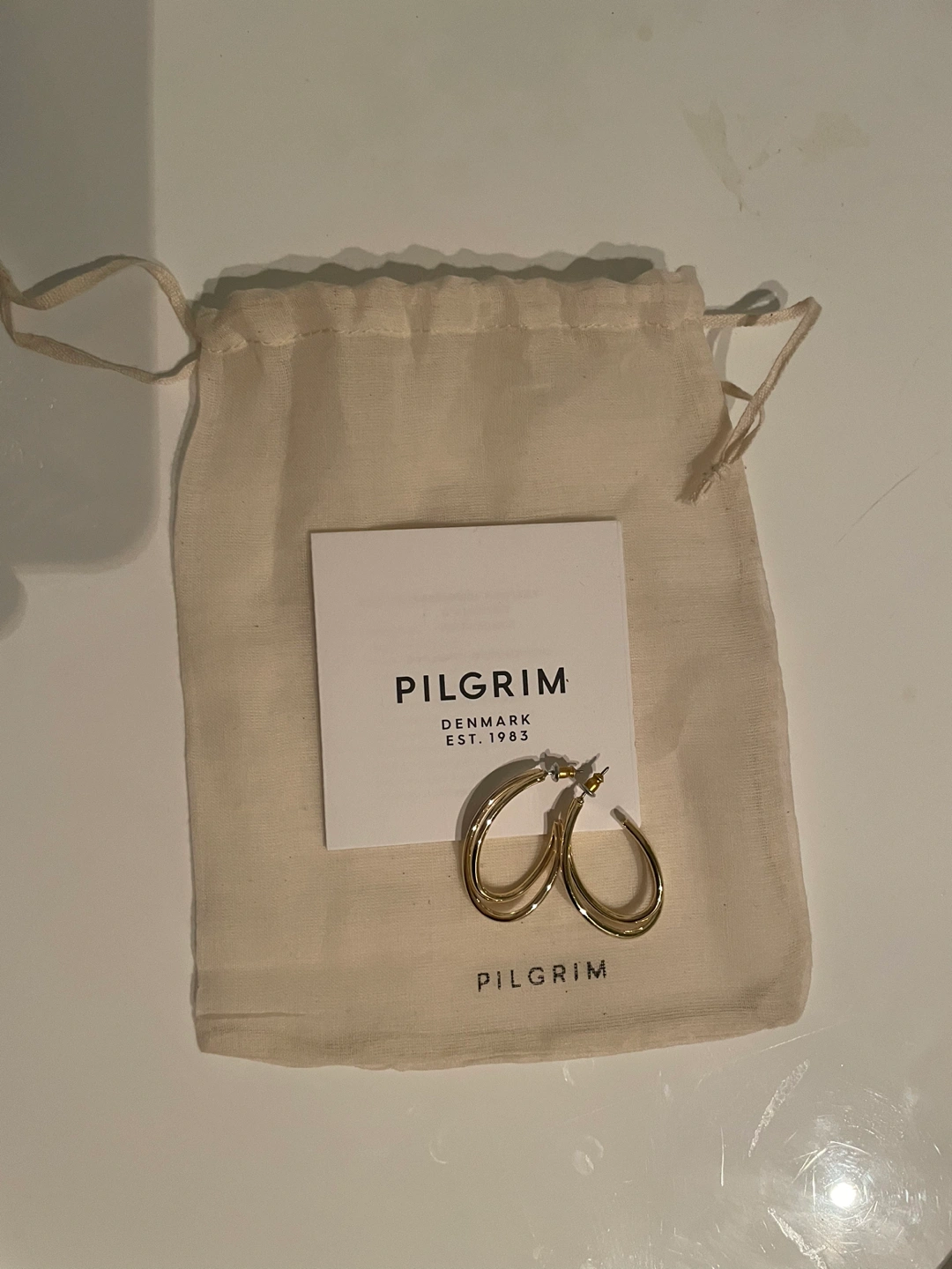 Super chic, gold plated hoops from PILGRIM. Very delicate and effortless looking. Never worn! Comes with the cute little bag shown in the first photo.