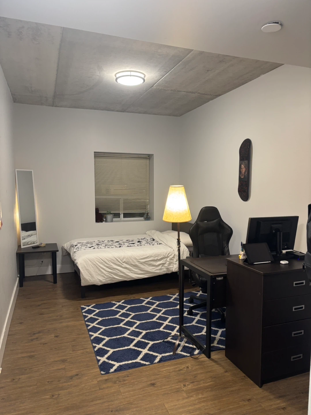 - Furnished room (bed, desk, chair, closet space).