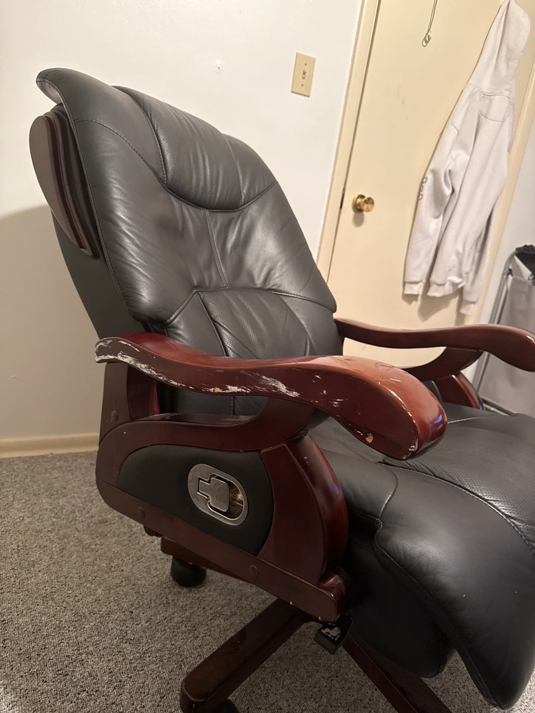 This is a black leather executive office chair with wooden accents. It features a high back and padded armrests for comfort. Some wear is visible on the armrests. This chair is designed for prolonged sitting.
