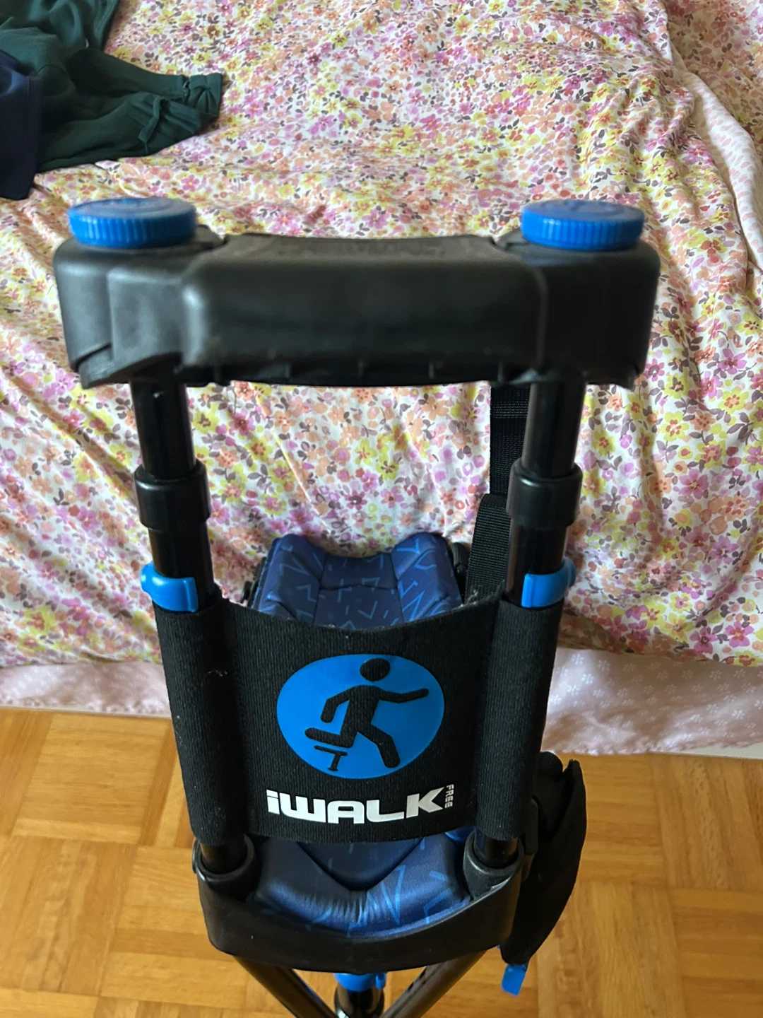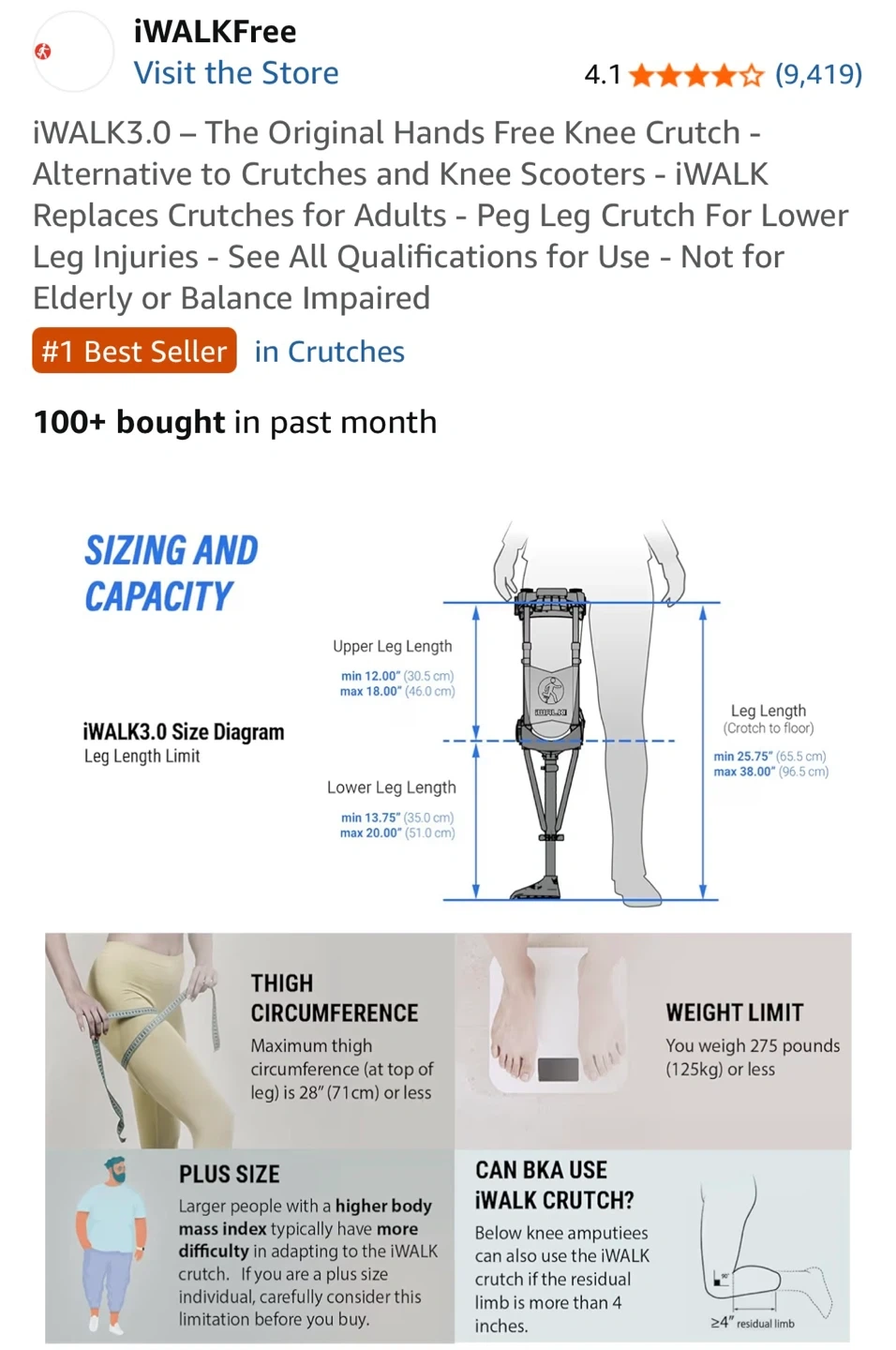 This iWALK 3.0 is a hands-free crutch alternative designed for users with lower leg injuries. It's adjustable and made for comfort during recovery. Maximum weight capacity is 275 lbs (125 kg).