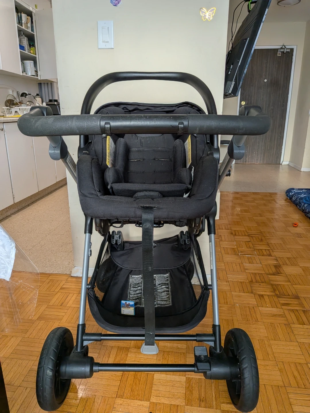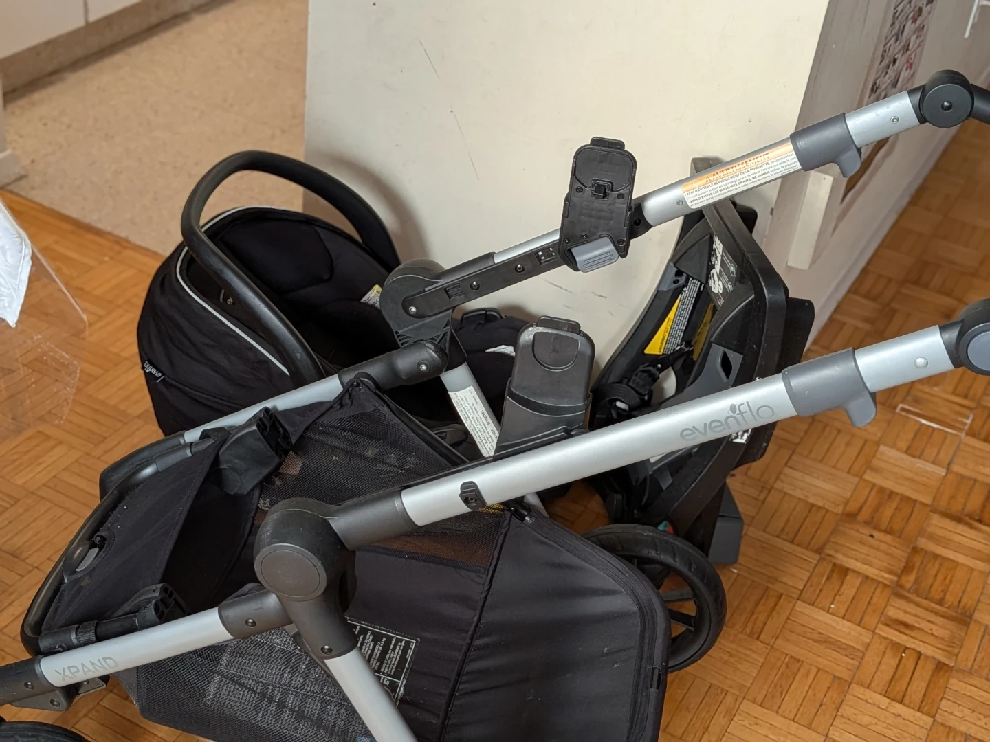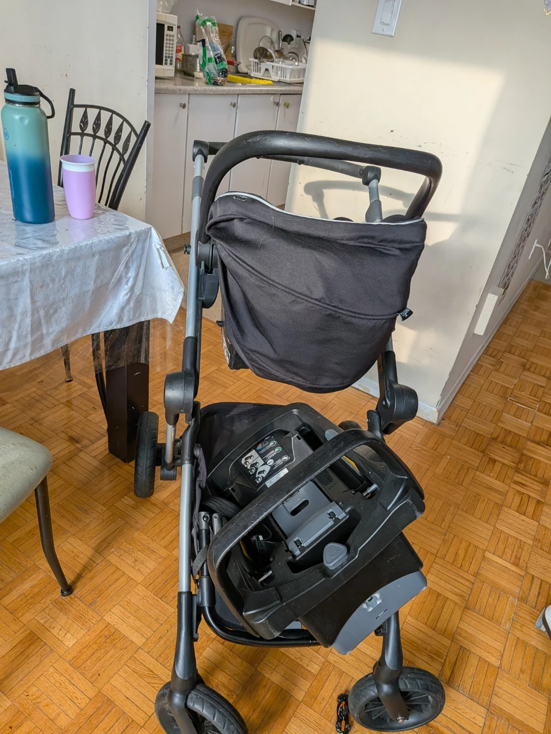 This Evenflo travel system includes a stroller and a car seat with its base. It's designed for convenience and ease of use for parents on the go. The stroller features adjustable handlebars and a large storage basket. Perfect for transporting infants from car to stroller seamlessly!