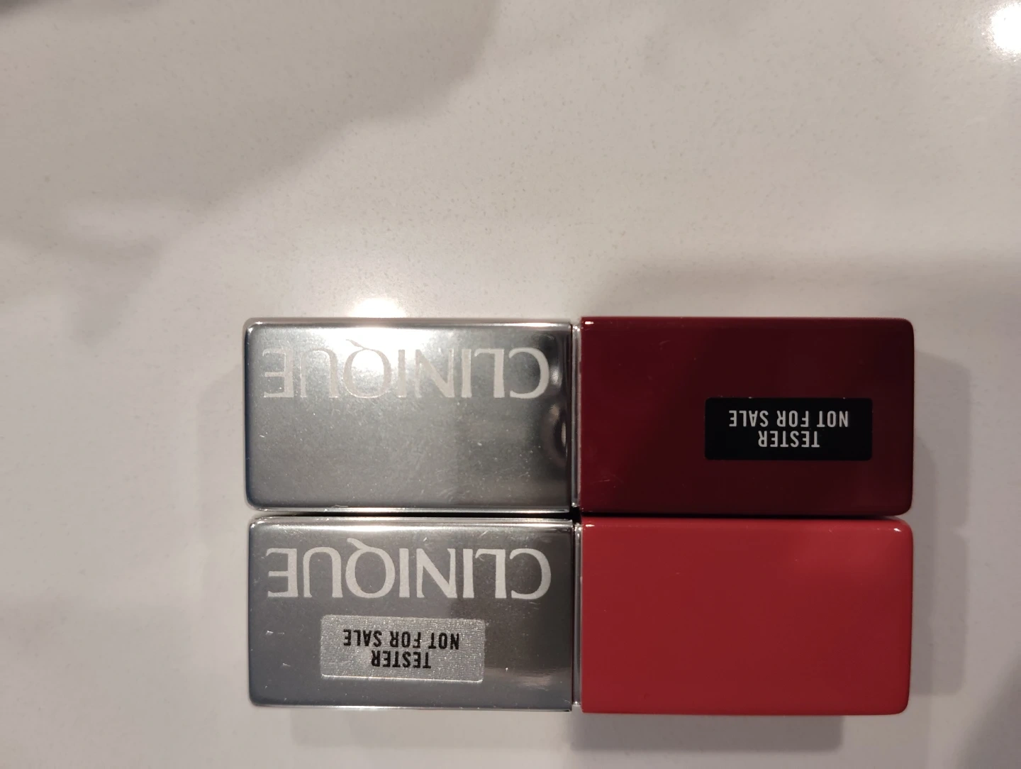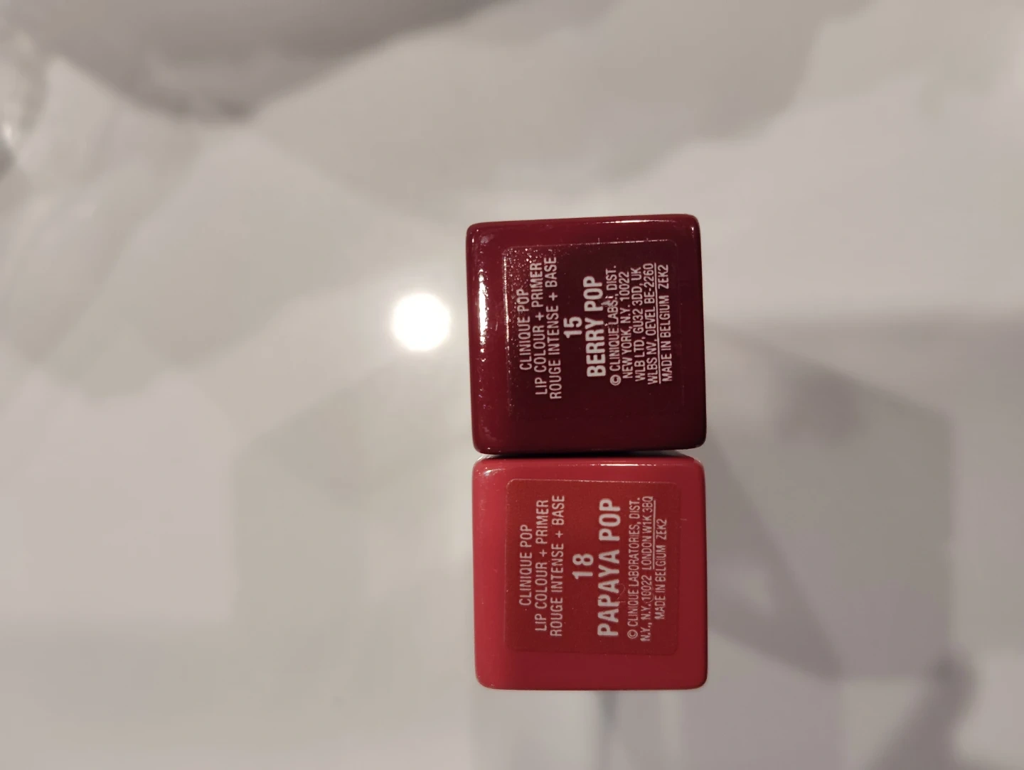 Two shades of Clinique Pop Lip Colour + Primer. Includes Berry Pop (15) and Papaya Pop (18). Testers $20 each