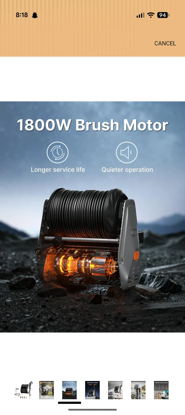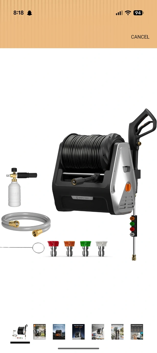 This Giraffe Tools retractable pressure washer reel offers automatic rewind and length lock. It has a 2900 PSI rating and 2.2 GPM flow rate. The unit features an 1800W brush motor for quieter operation and longer service life. It's designed for space-saving wall mounting.