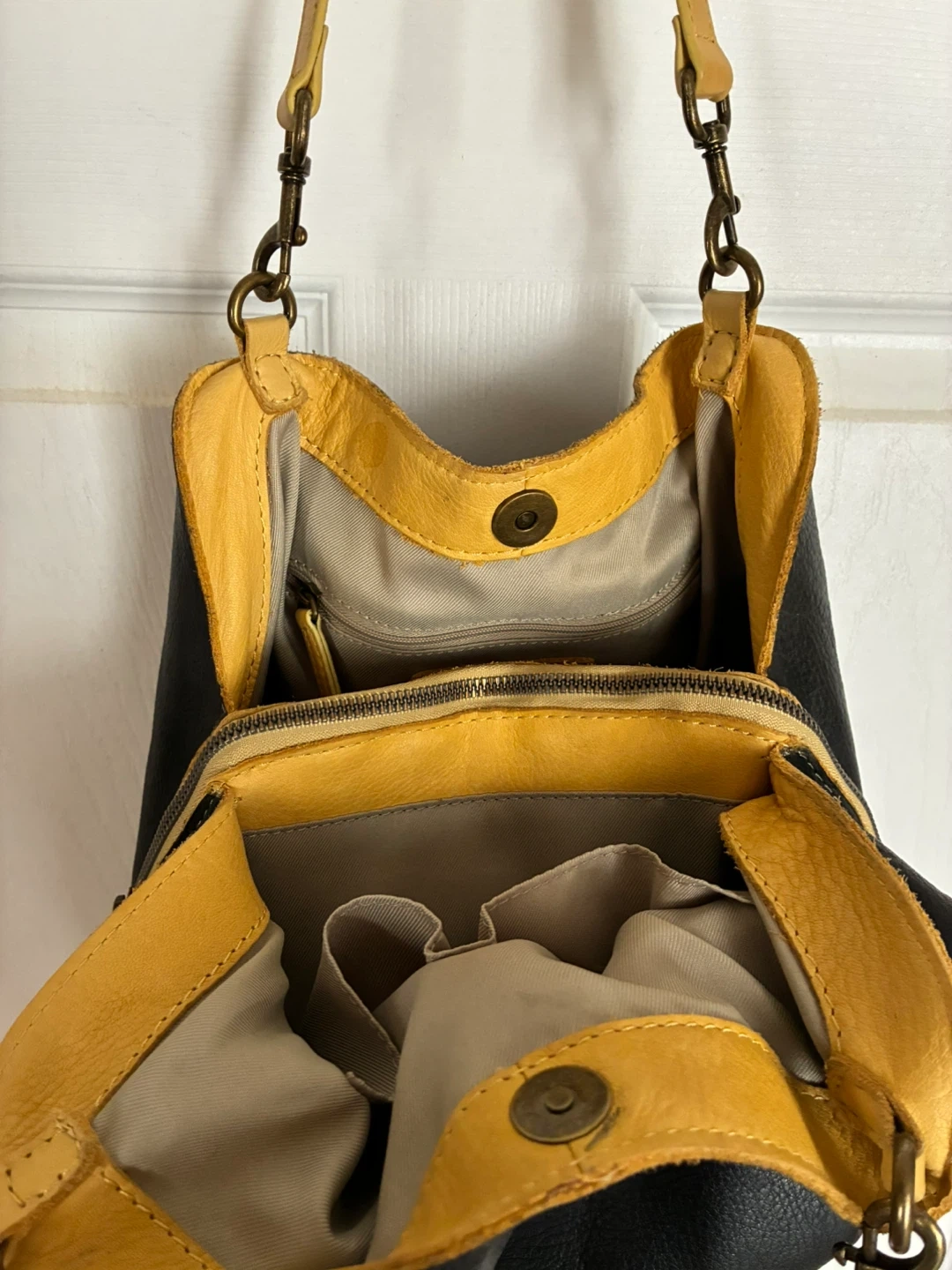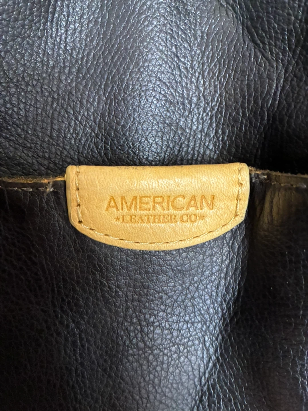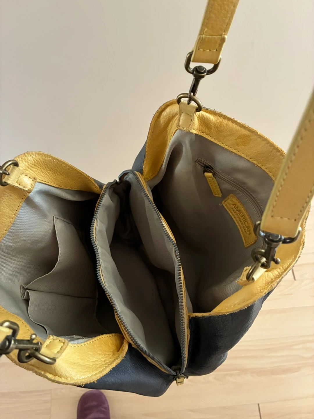 Black soft leather shoulder bag from American Leather Co. features a yellow interior and strap accents.