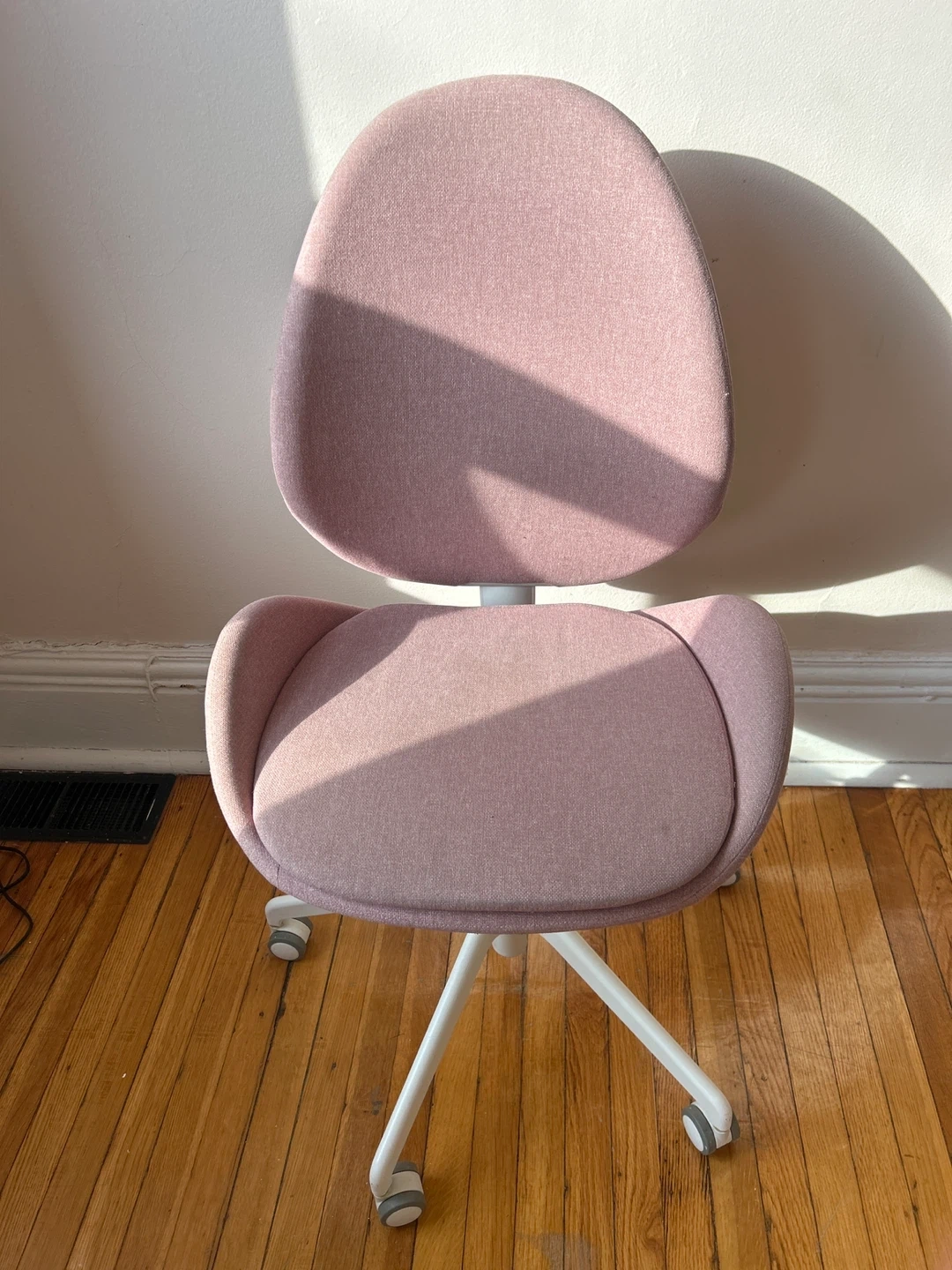 This upholstered office chair comes in a soft pink fabric. It's designed with a supportive backrest and a comfortable seat. The chair has a sturdy base with five casters for easy mobility. It's perfect for a home office or study area.