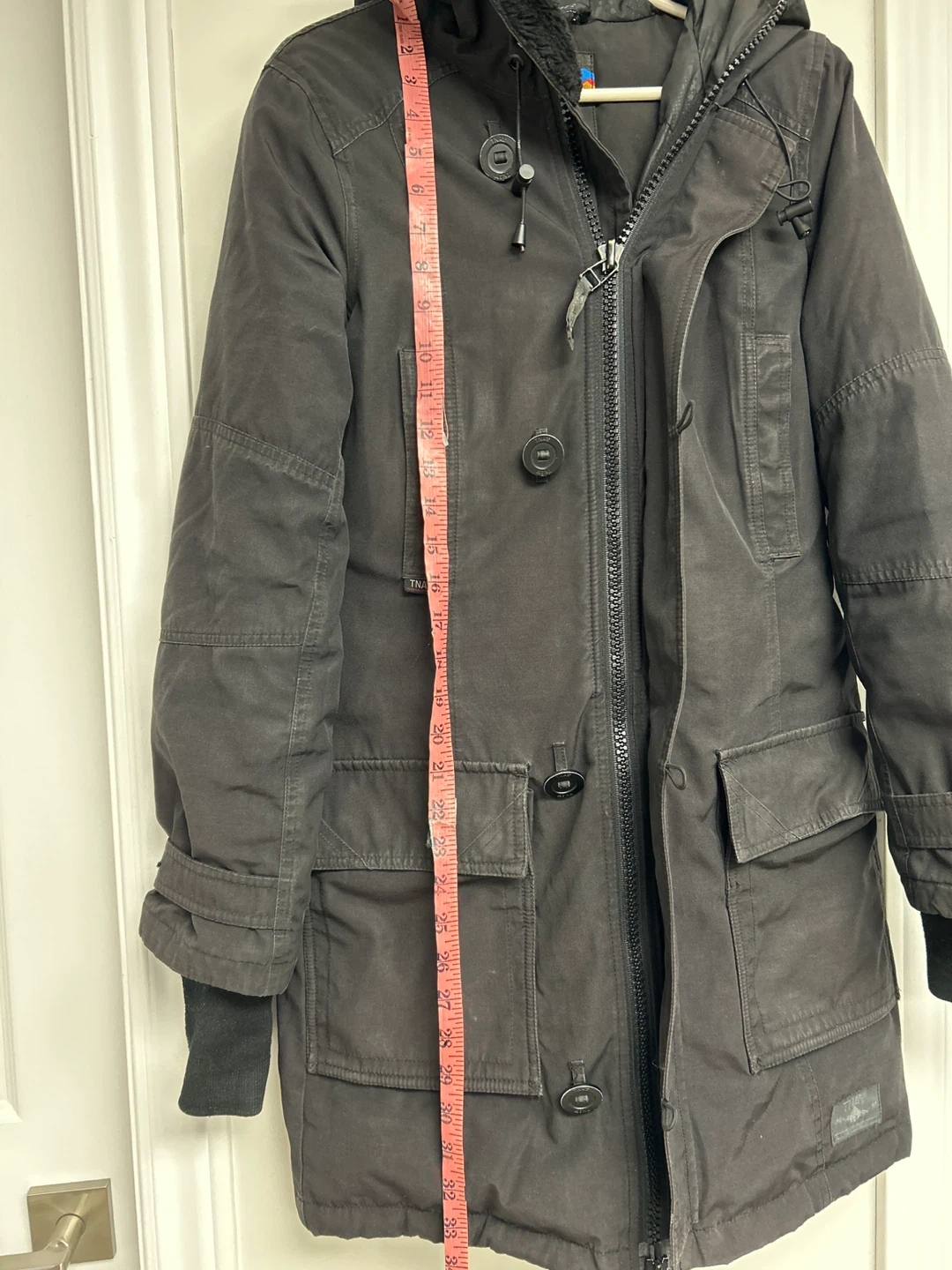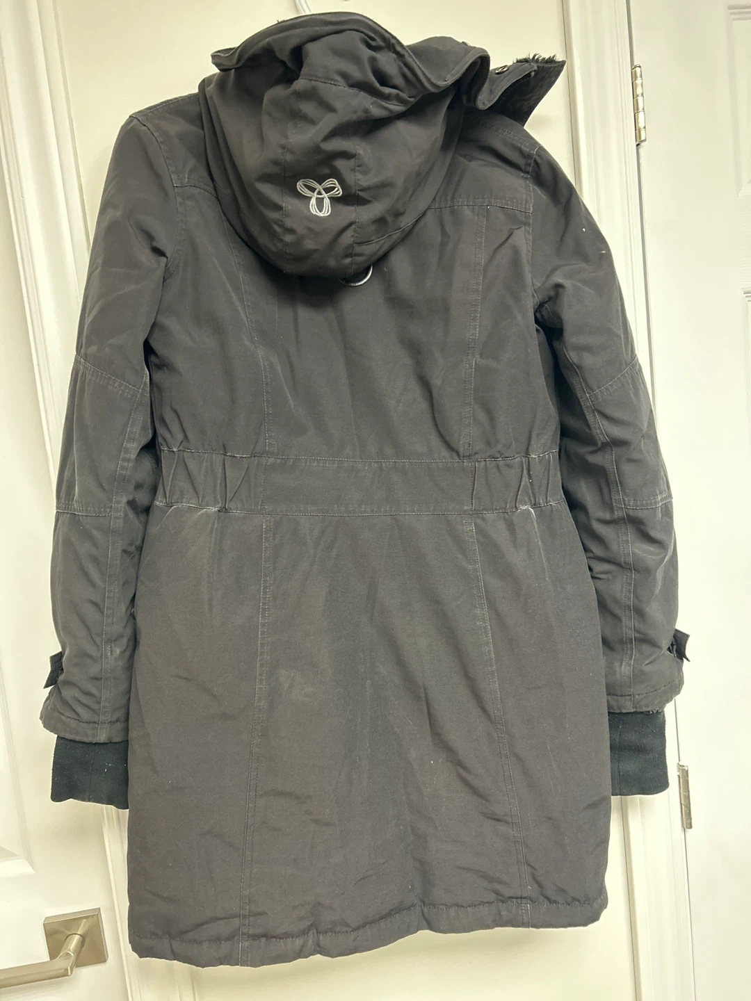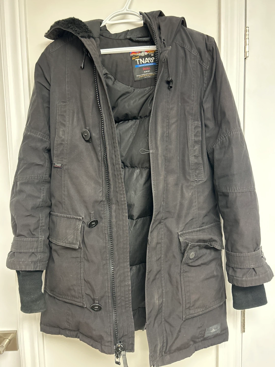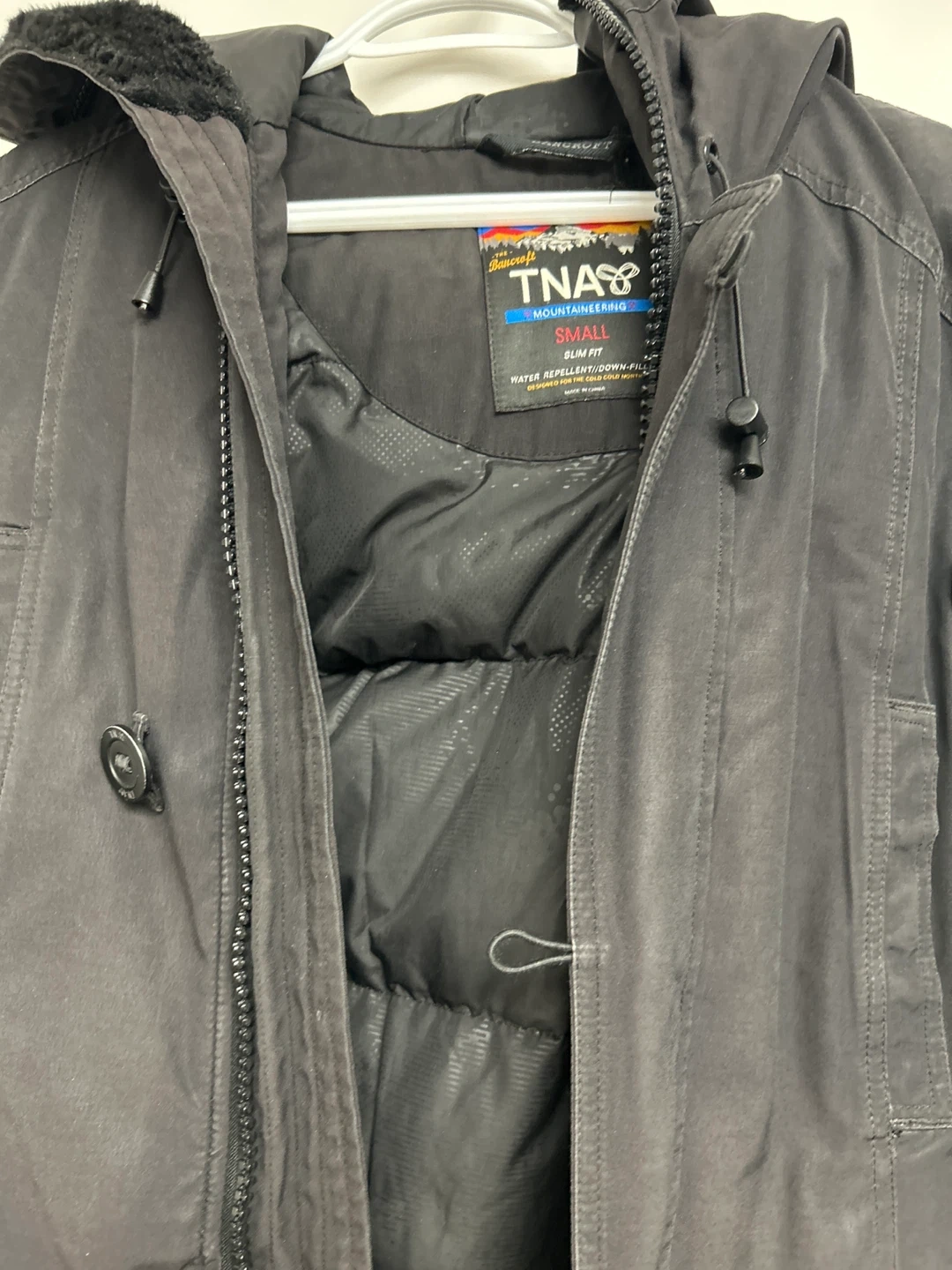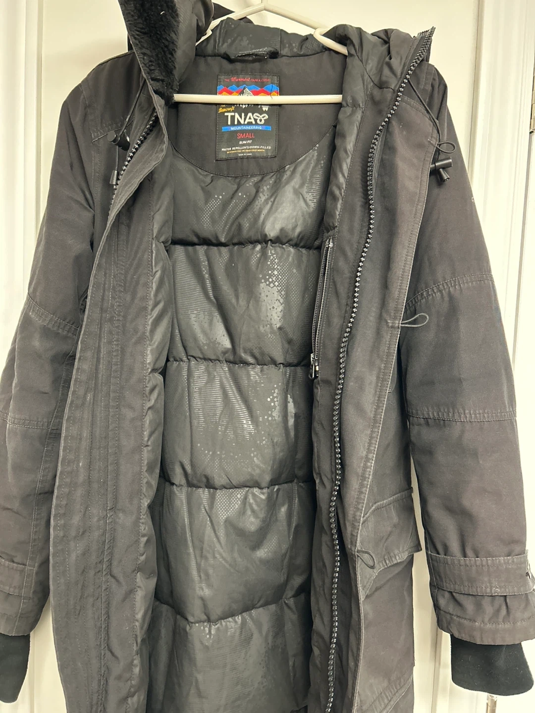 This TNA parka is designed for cold weather. It's a size small and features a water-repellent outer shell with down filling. The hood is lined with faux fur. Perfect for staying warm during chilly days!