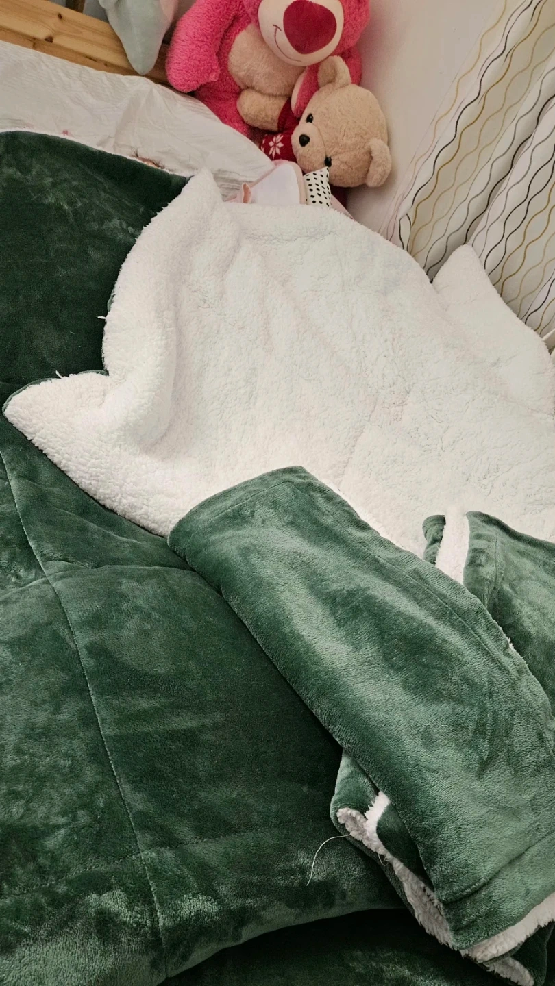Cozy green plush throw blanket with a soft white sherpa lining. It's perfect for snuggling up on the couch or adding an extra layer of warmth. Generously sized for comfort.