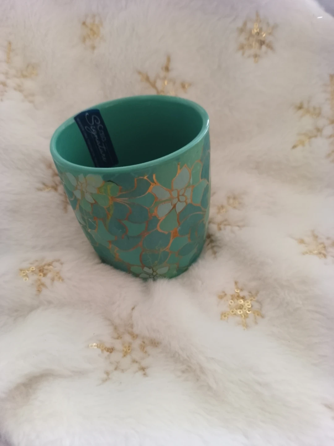 A stylish teal mug with a floral design and a shimmering gold handle. It's made of ceramic for durability. This mug is perfect for enjoying your morning coffee or tea!