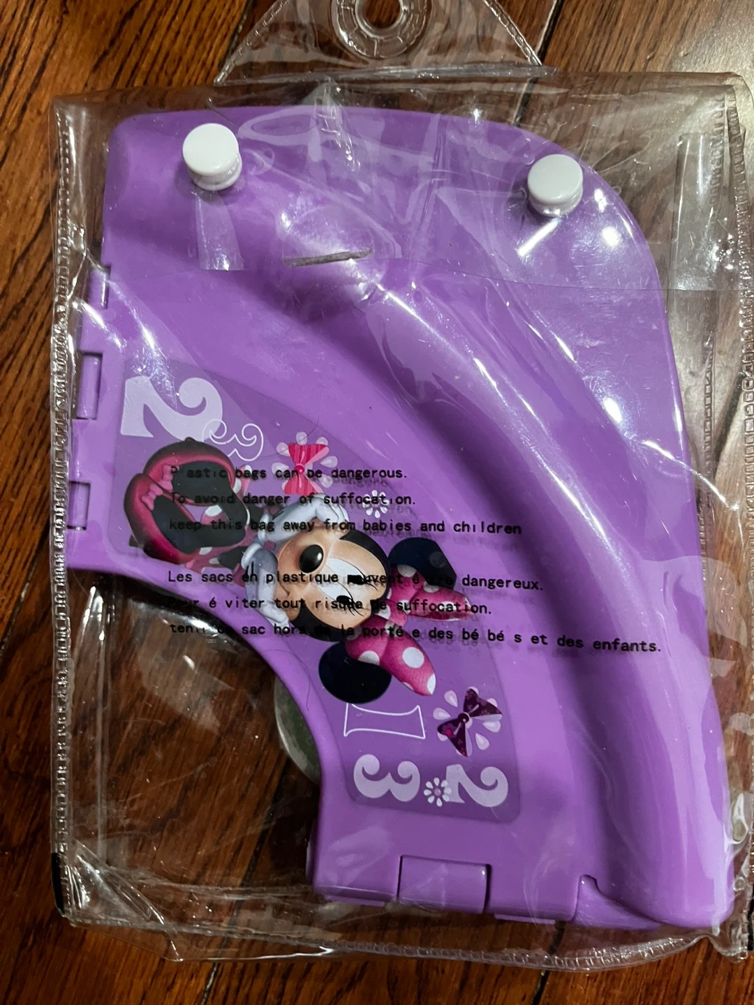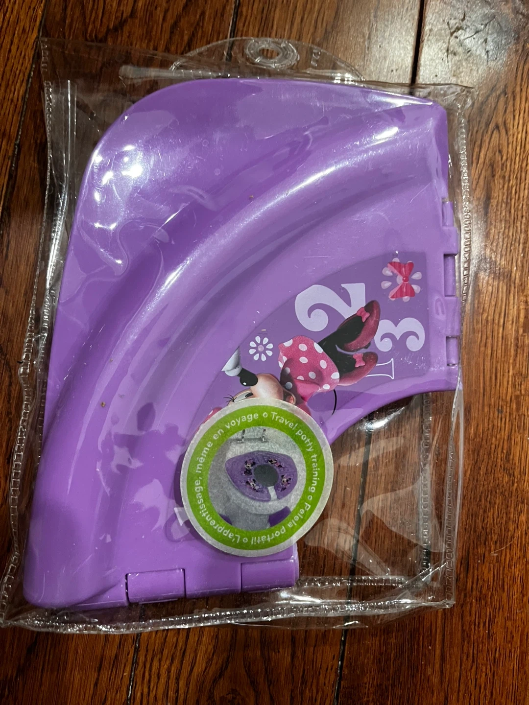 This is a Disney Minnie Mouse potty training seat. It's purple and features Minnie Mouse graphics. It's designed for travel and potty training.