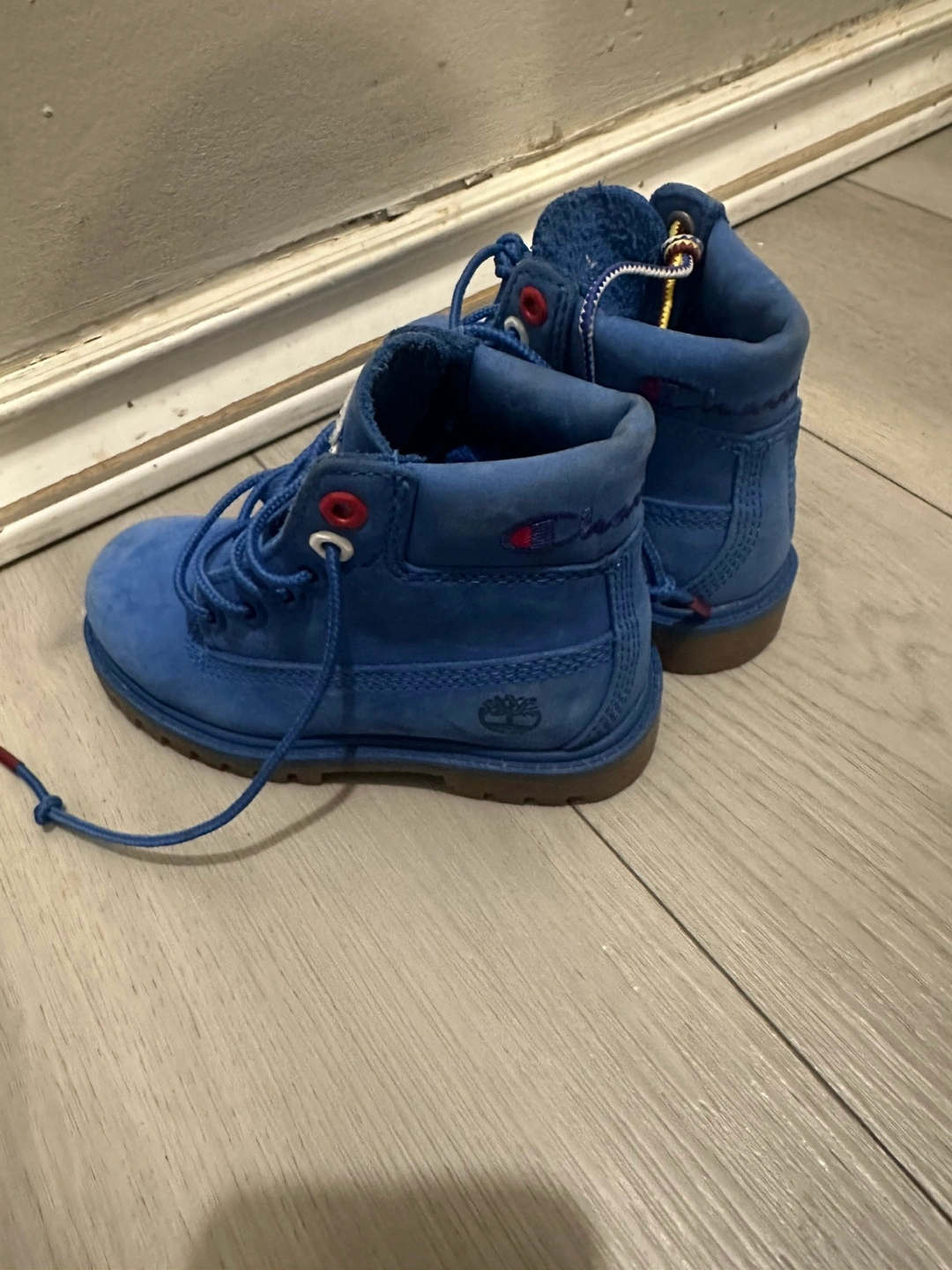 Size 9 Blue Timberland boots for toddlers. These durable boots feature lace-up fronts and side zippers for easy on and off. Perfect for keeping little feet warm and dry!