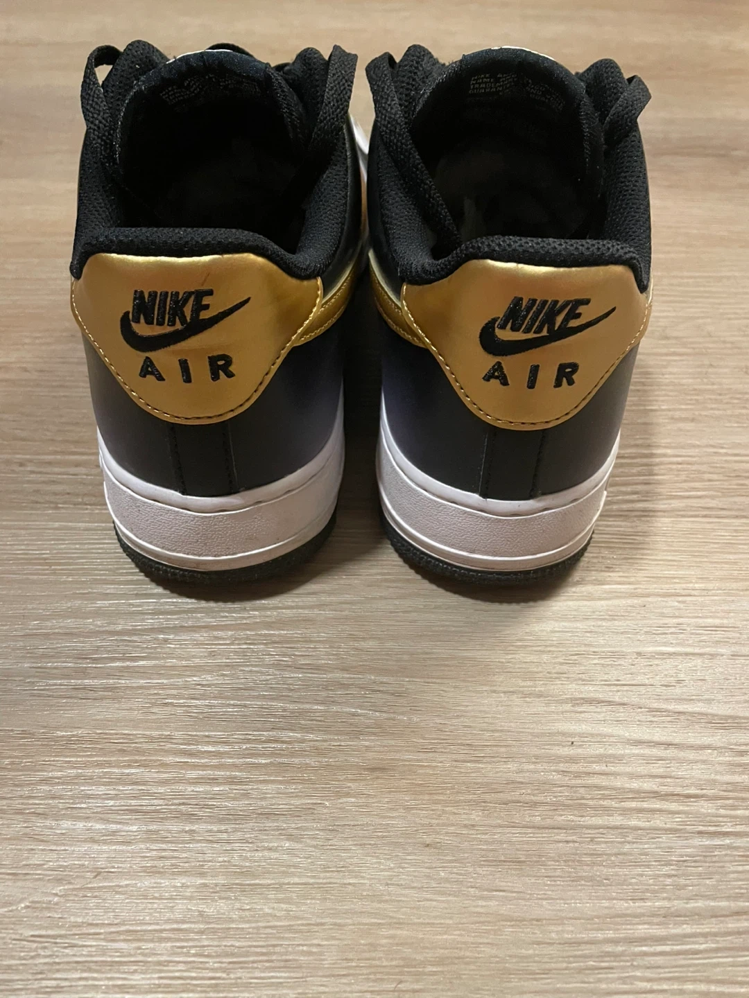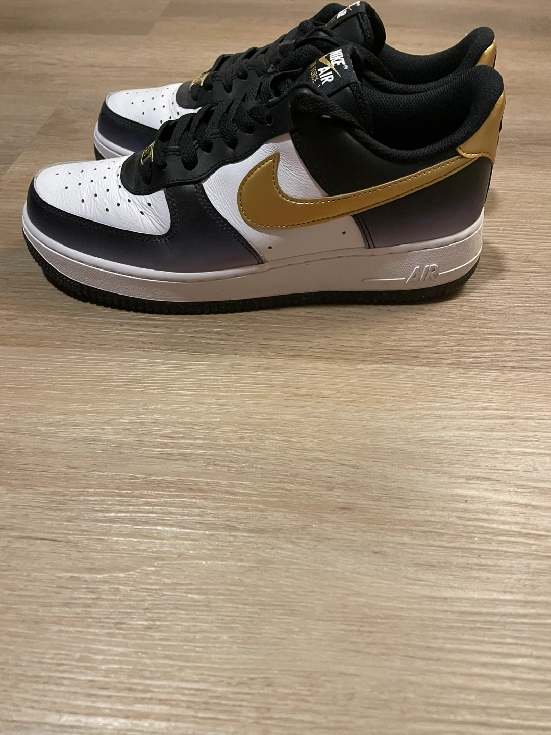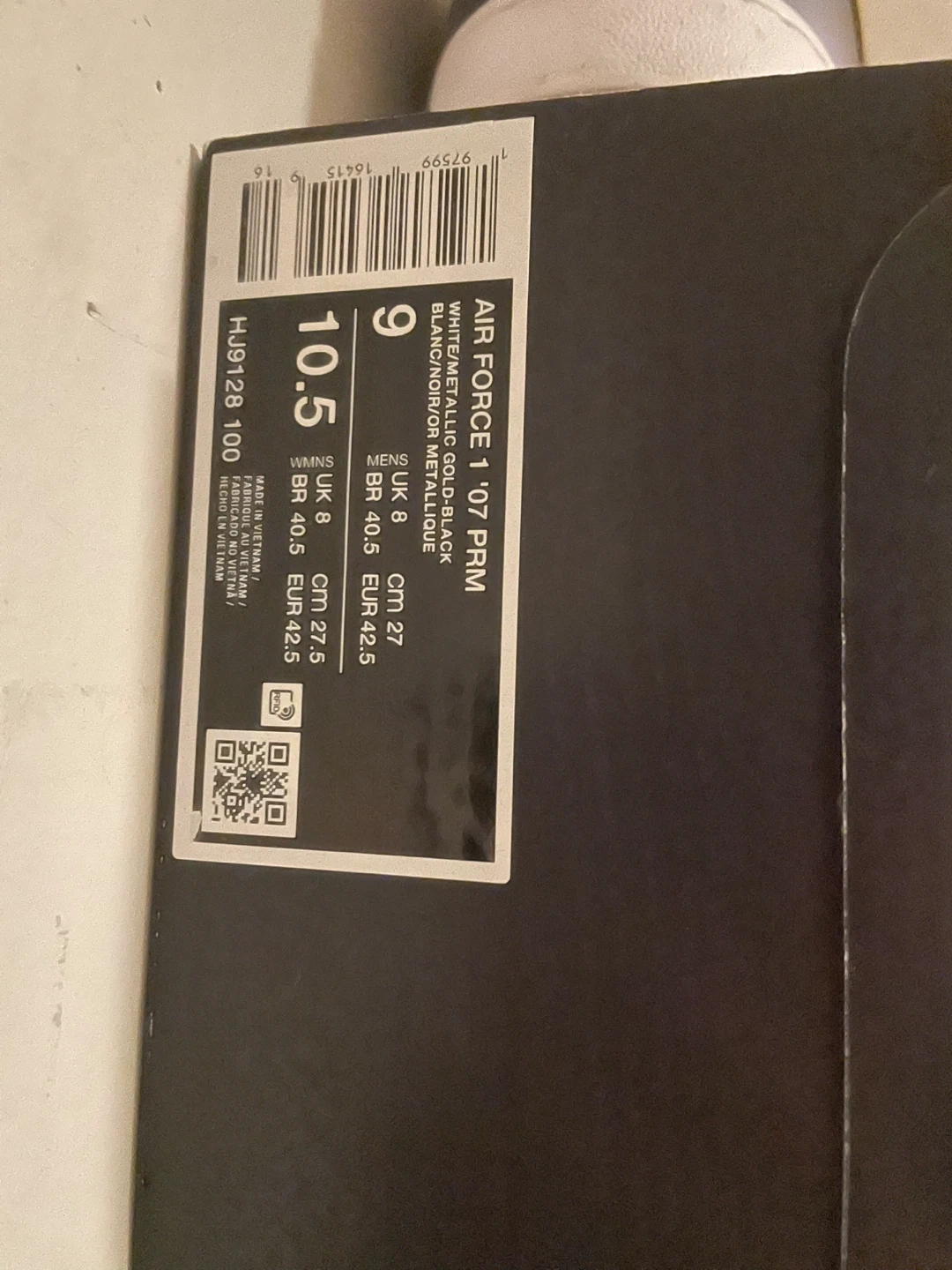 Selling a pair of Nike Air Force 1 '07 PRM sneakers! These are in a white/metallic gold-black colourway. The size is a mens 9 (US). Comes with the original box!