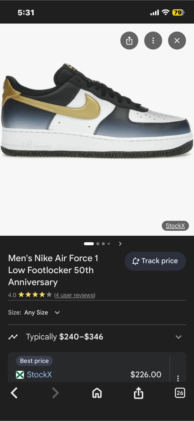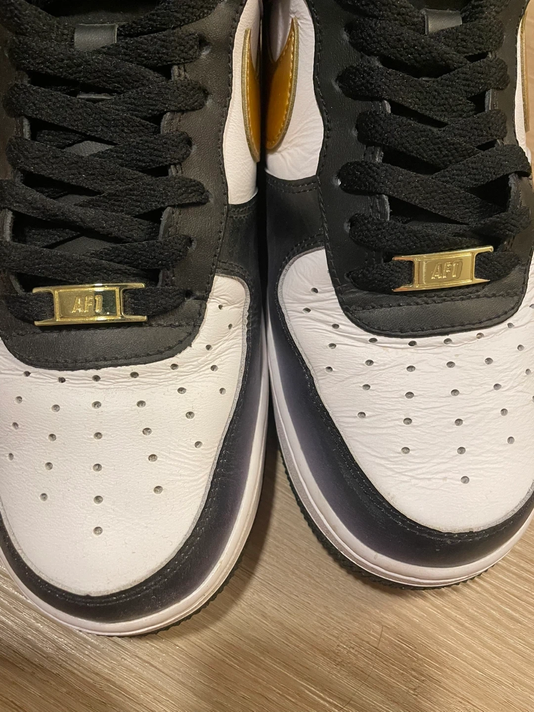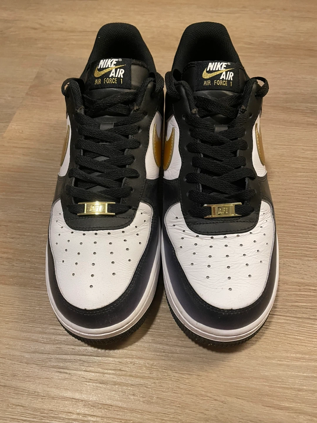 Selling a pair of Nike Air Force 1 '07 PRM sneakers! These are in a white/metallic gold-black colourway. The size is a mens 9 (US). Comes with the original box!