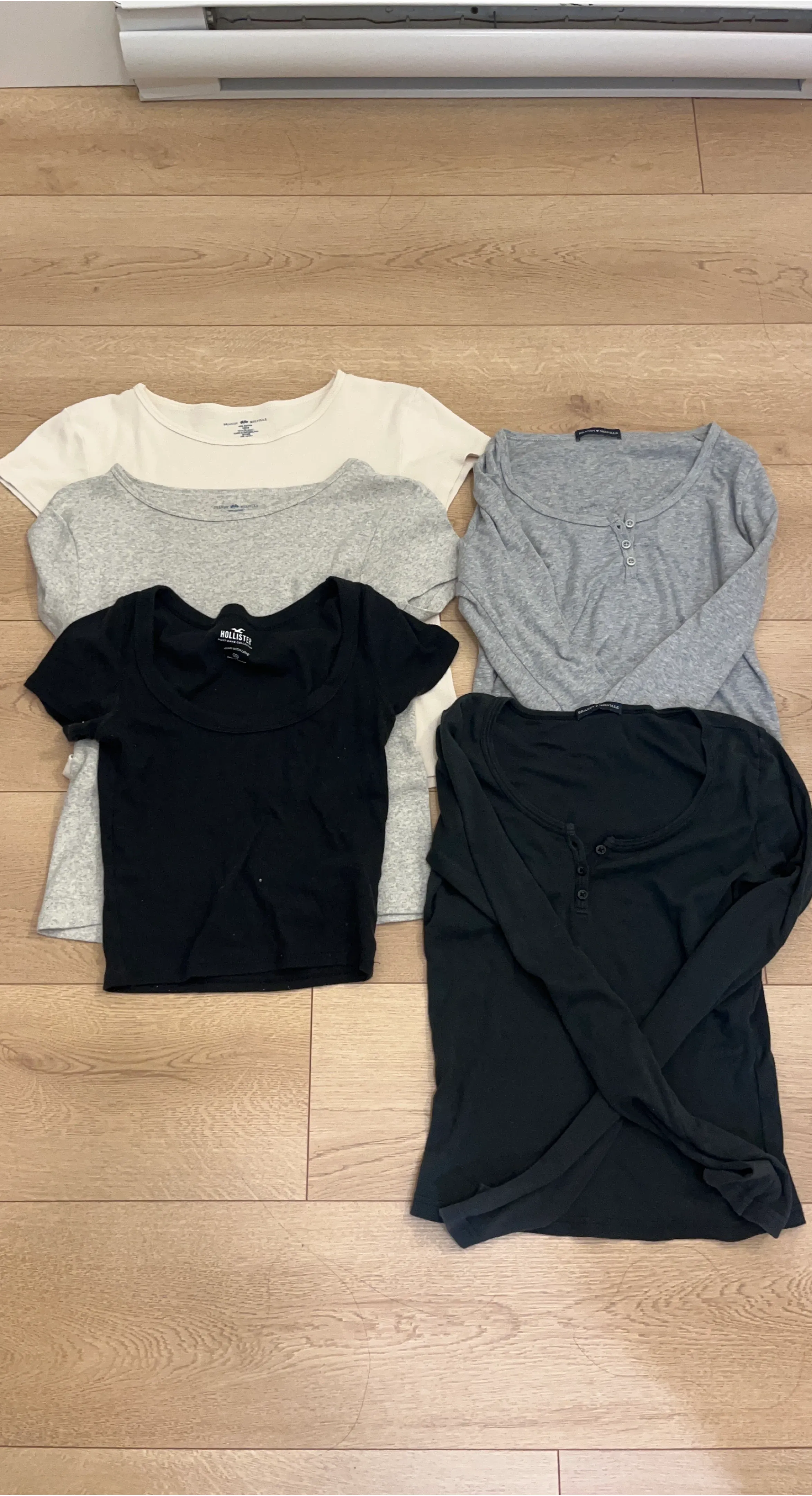 Bundle of four t-shirts. Includes two Brandy Melville long sleeve henleys, one Hollister ribbed black t-shirt, and one Brandy Melville grey marled t-shirt. Cotton blend material.