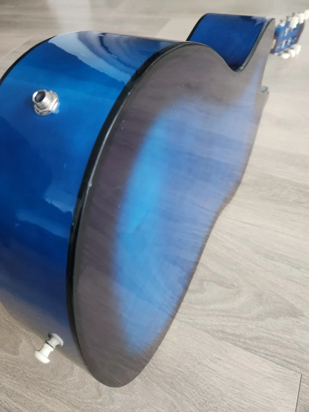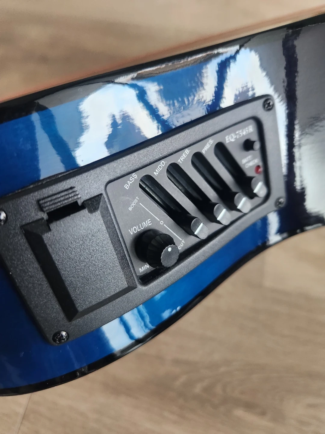 This is a BRAND NEW blue acoustic-electric guitar with a cutaway body. It features onboard EQ controls for volume, bass, mid, and treble. A great starter instrument for aspiring musicians!