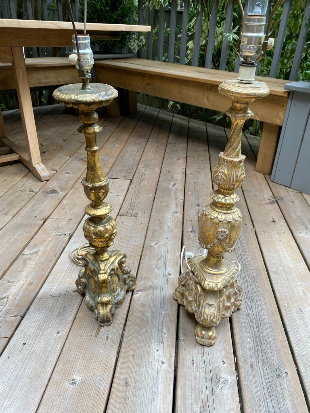 ⭐️2 gilded antique wooden alter pricket candlesticks made into lamps with original paint and natural patina and distressing.