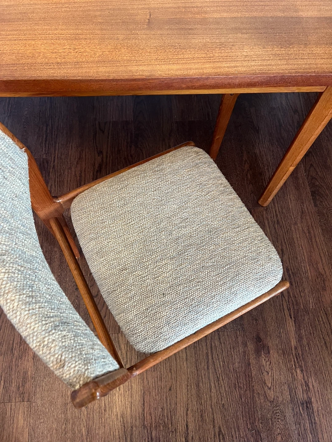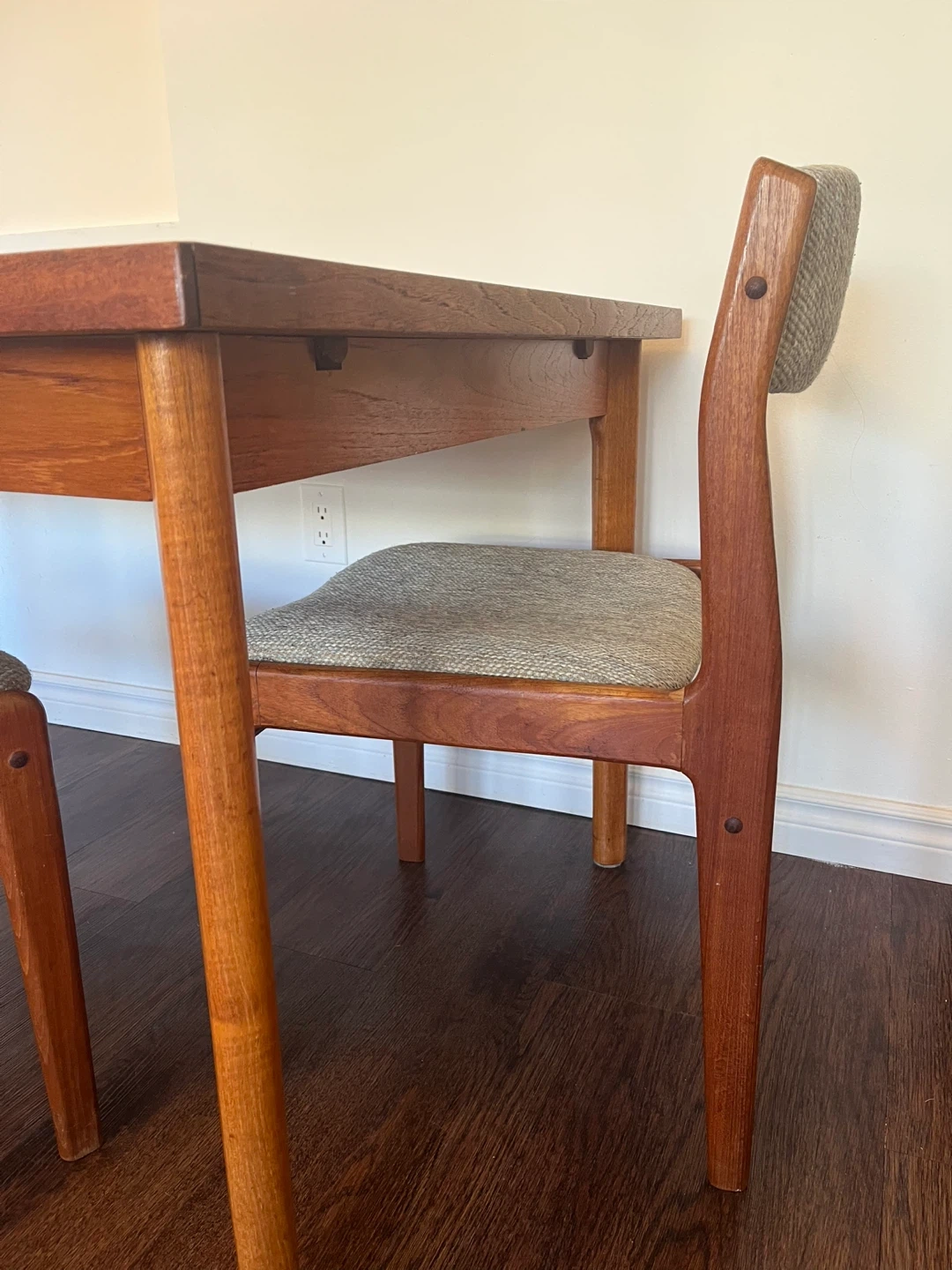 Selling a set of two mid-century modern dining chairs. They have a wooden frame and a neutral-toned fabric seat and back. They're in good condition and would look great in any dining room. Recently polished with orange oil, for teak furniture.