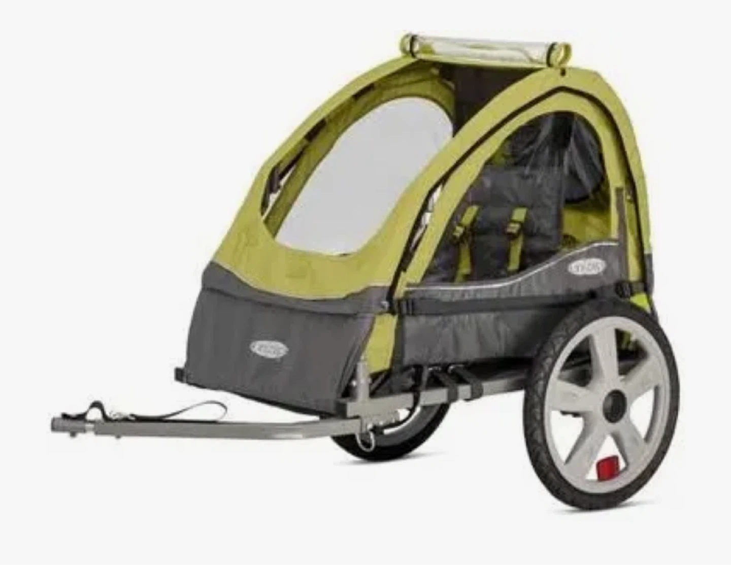 Graco double child trailer in a lime green and grey color scheme. It features a comfortable padded seat with a 5-point harness system. The trailer has large wheels for a smooth ride and a durable canopy.