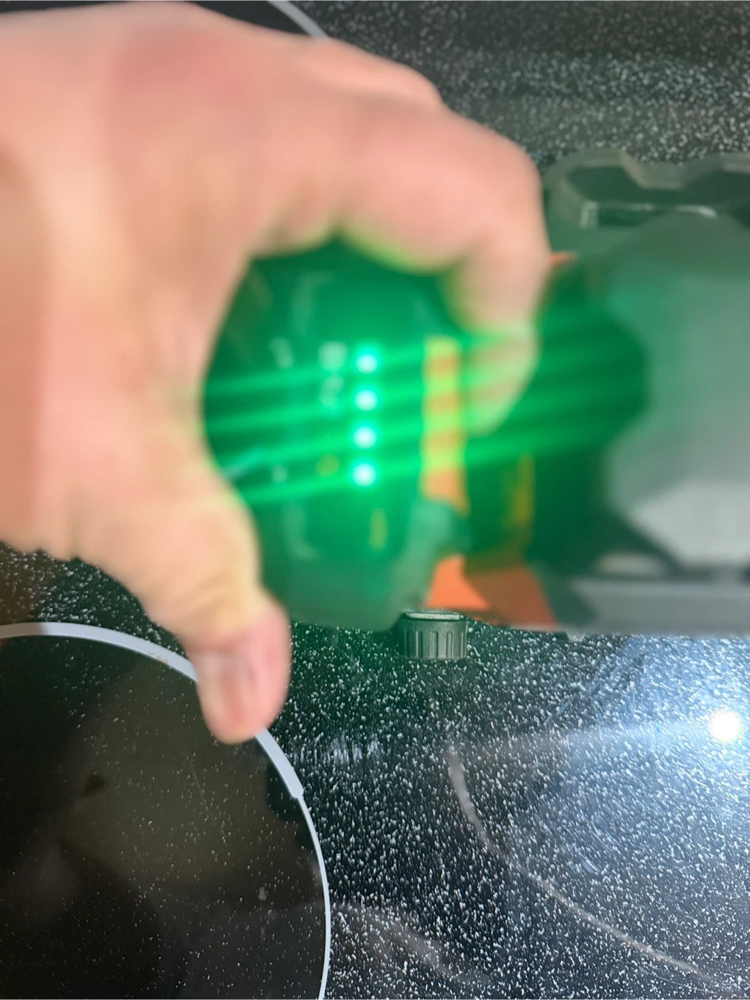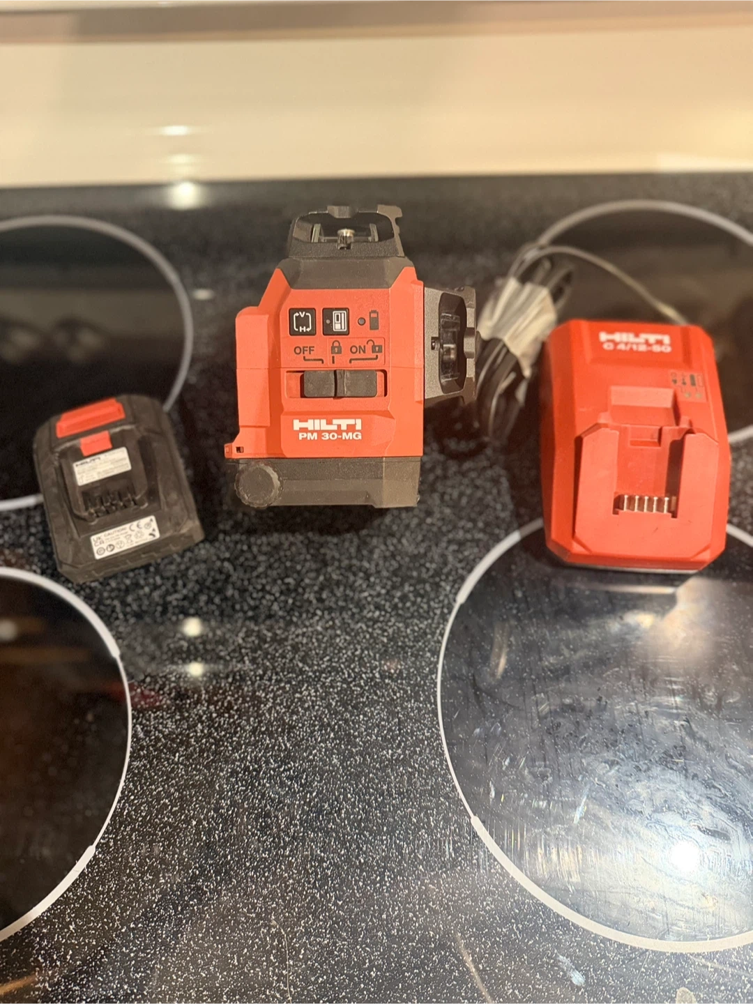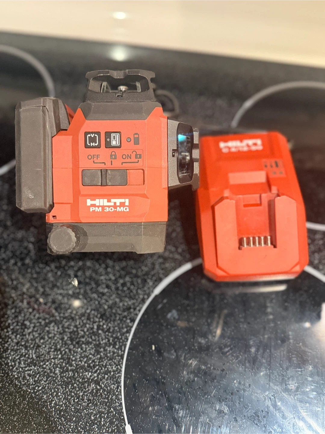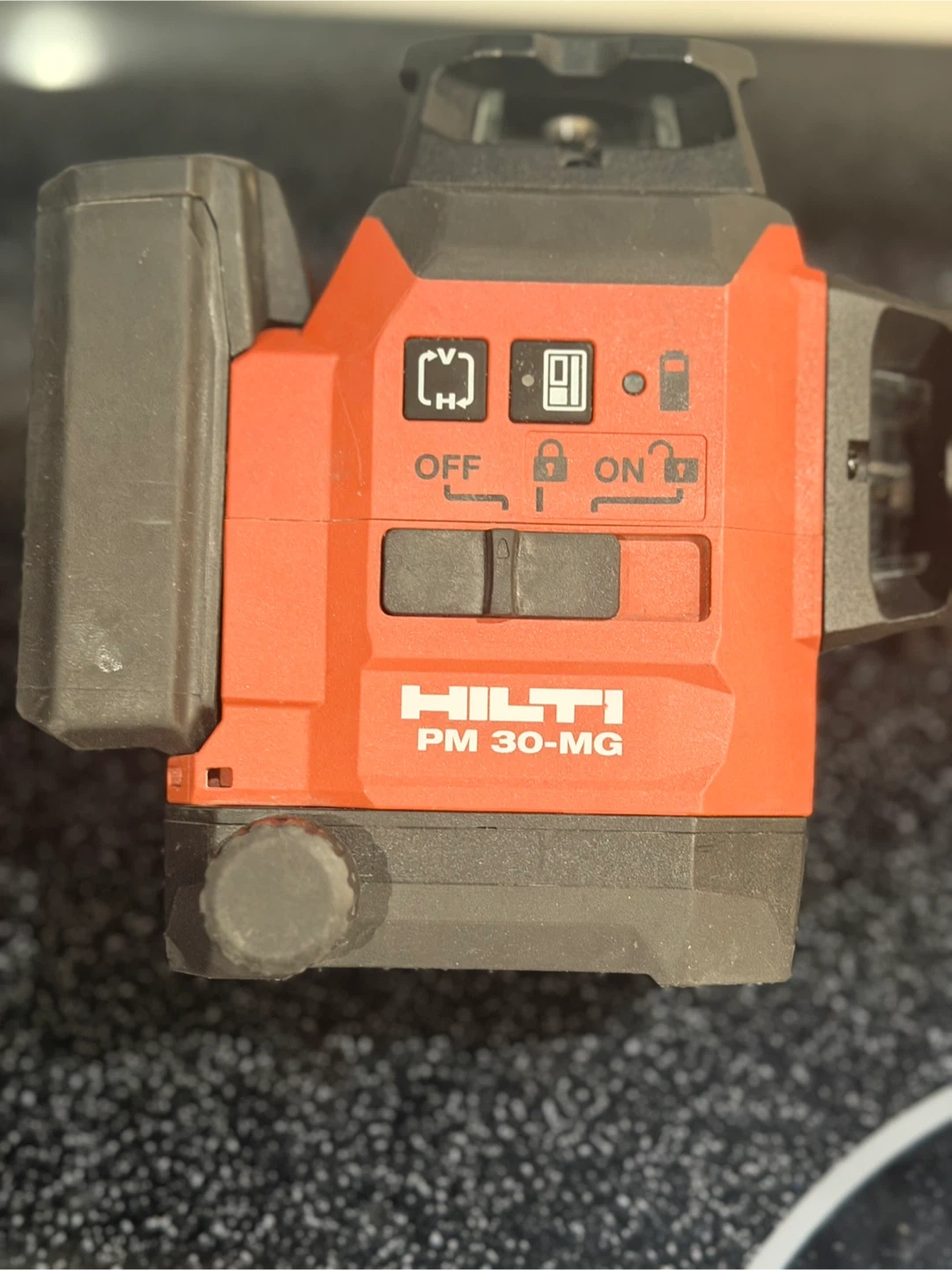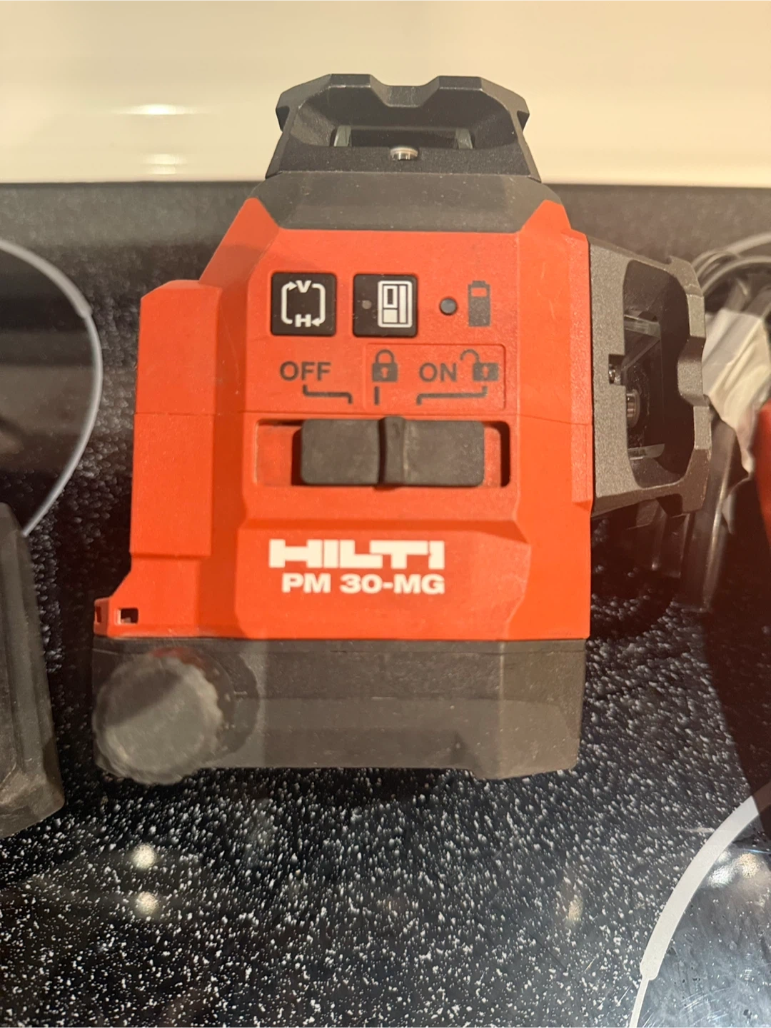 Hilti PM 30-MG laser level with a rechargeable battery. It's green laser technology. This tool is for precise alignment and measurement on construction sites. Tool has been used once .