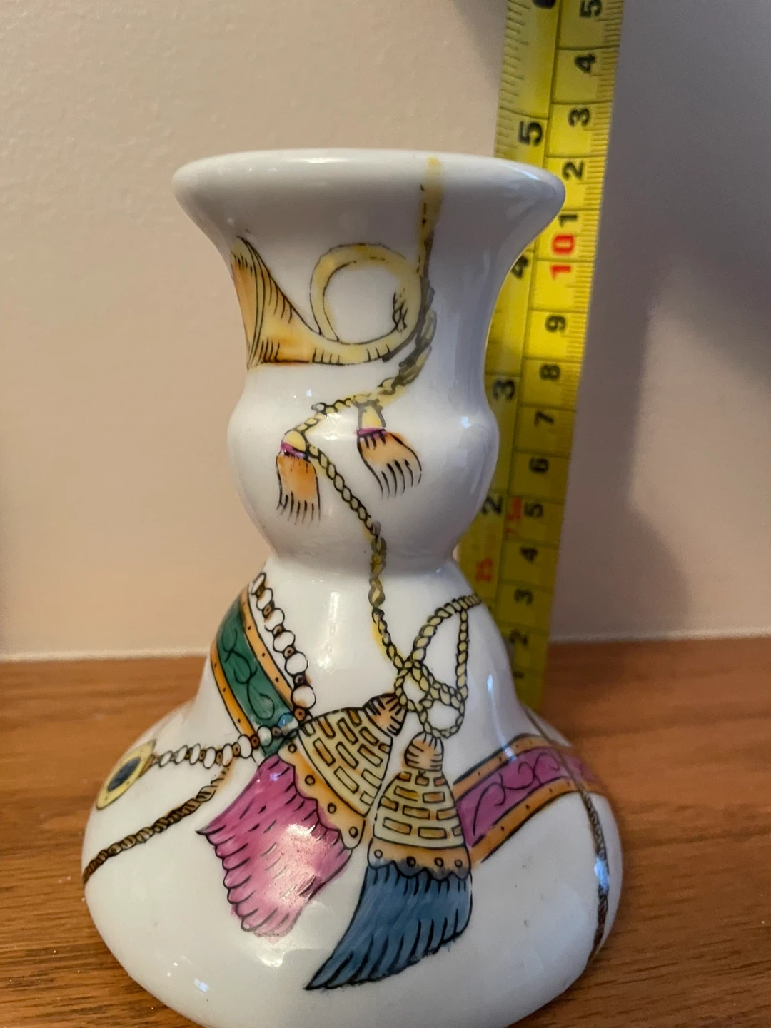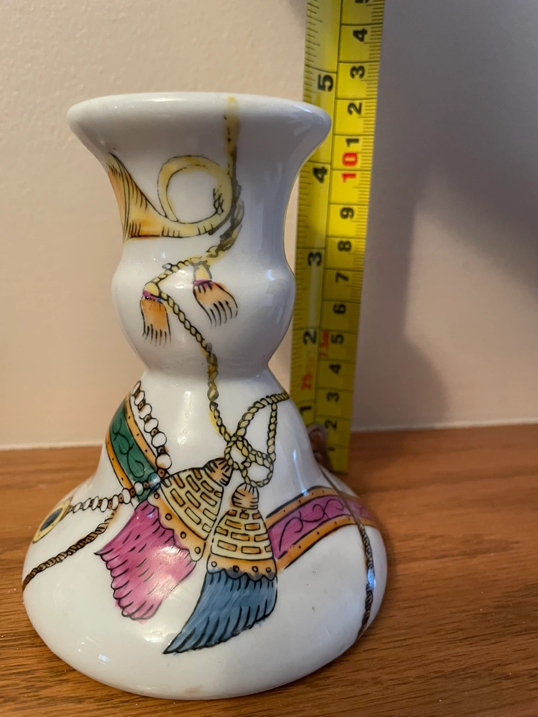 This charming ceramic candlestick holder features a decorative design with colourful tassels and chain accents. It's perfect for adding a touch of vintage flair to your decor. Made of ceramic material.