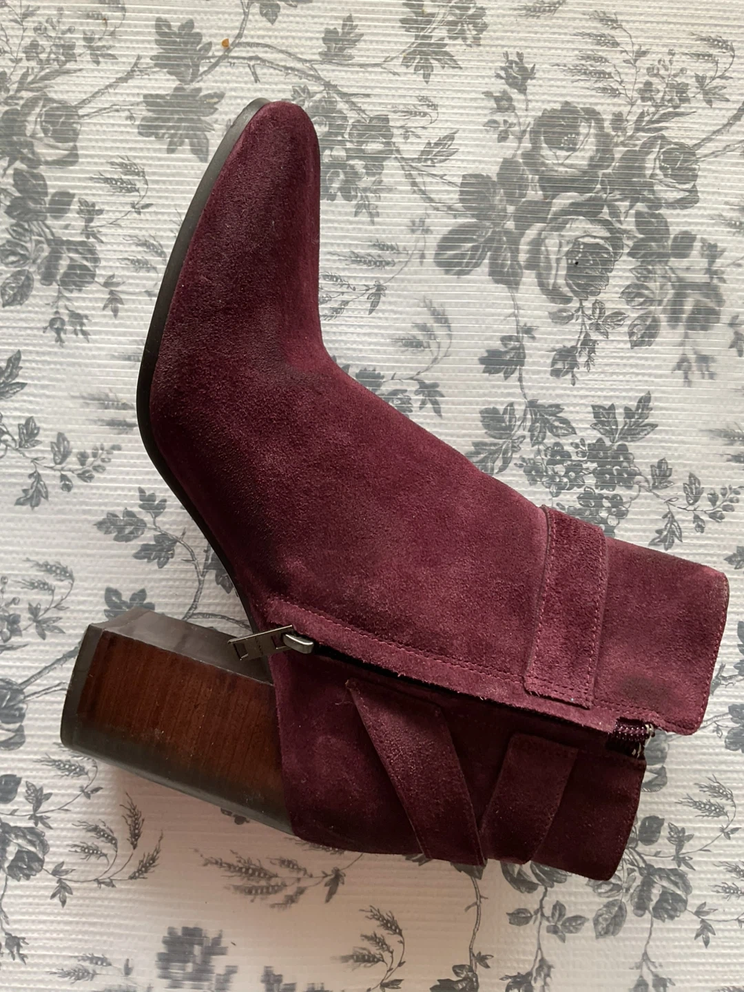 Burgundy suede ankle boots with a block heel. These boots have a side zipper closure and buckle detail. They're made of suede with a leather interior.
