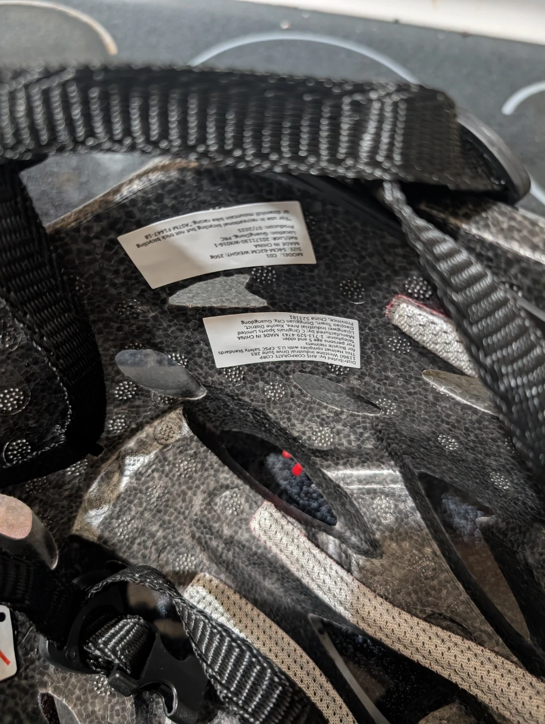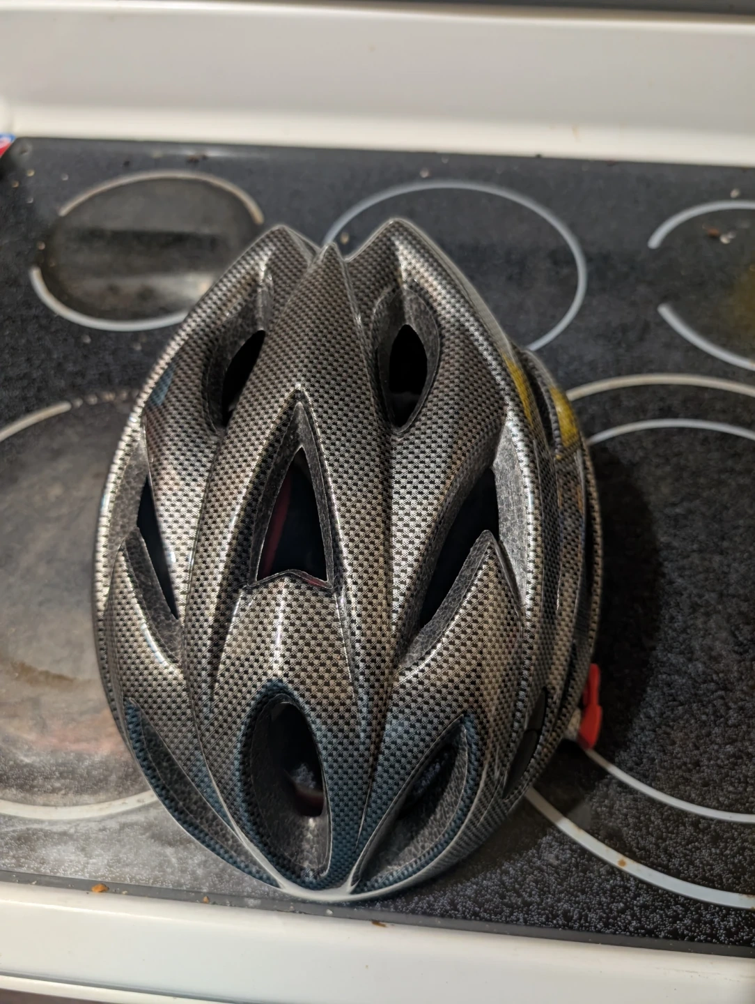 This is a black and silver cycling helmet with a carbon fibre pattern. It features adjustable straps and a dial for a custom fit. It's designed for adult riders. I bought this helmet for a second backup. But never ended up using it.