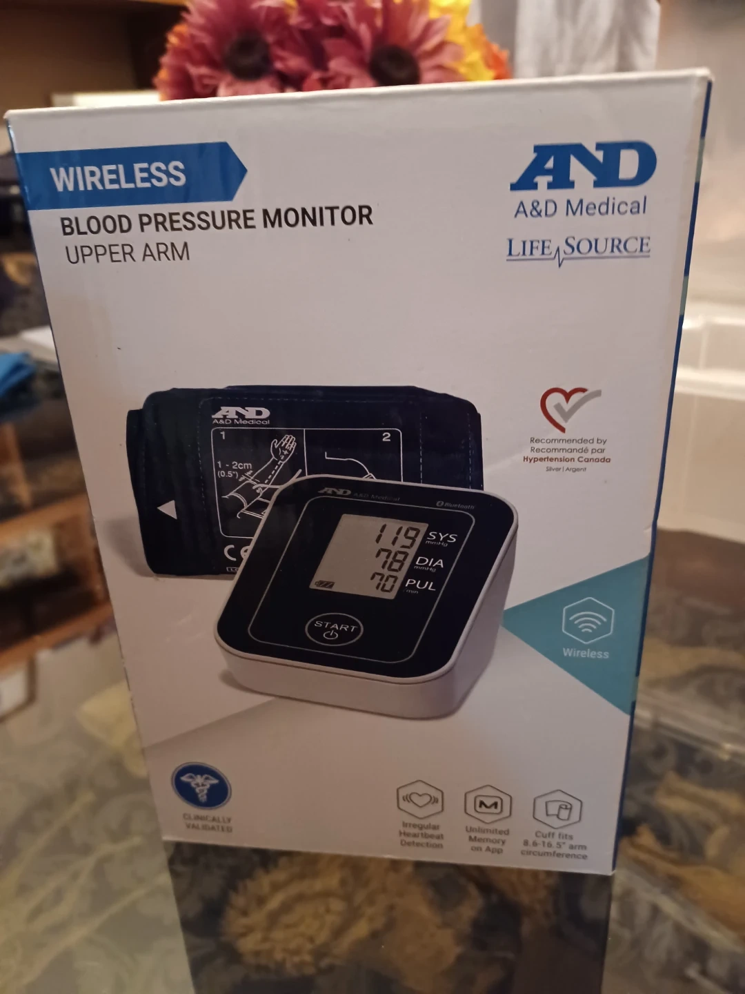 Selling a wireless blood pressure monitor by A&D Medical. It's an upper arm monitor with LifeSource technology. It features irregular heartbeat detection, unlimited memory on the app, and a cuff that fits 8.6-16.5" arm circumference. It's clinically validated and recommended by Hypertension Canada
