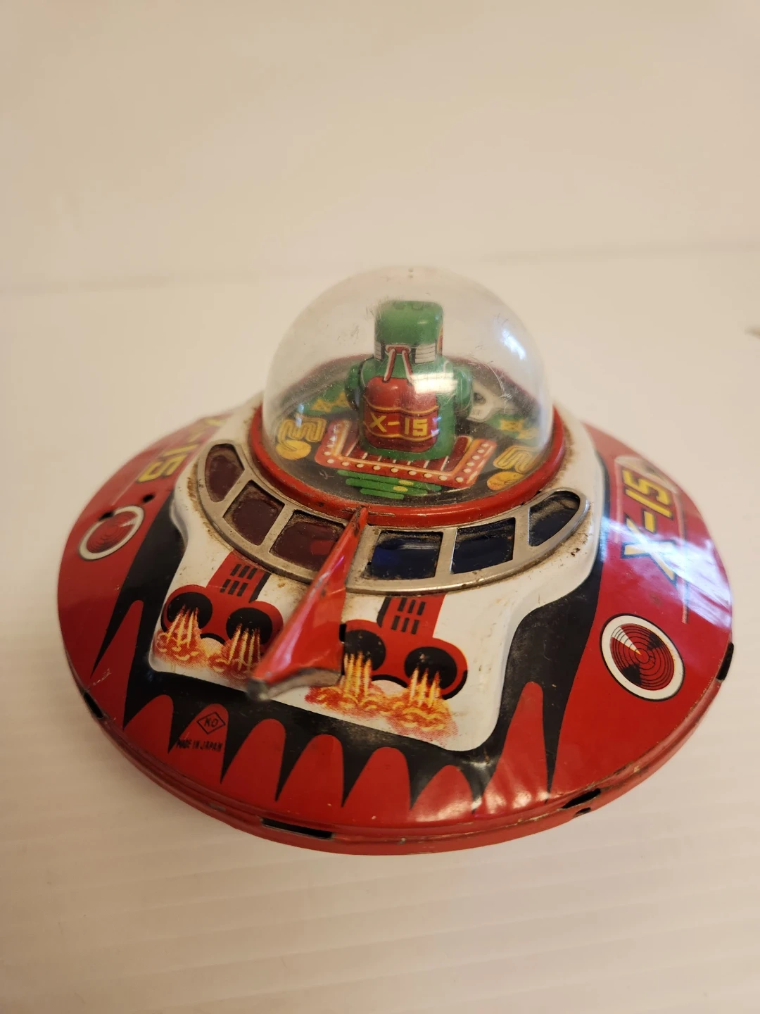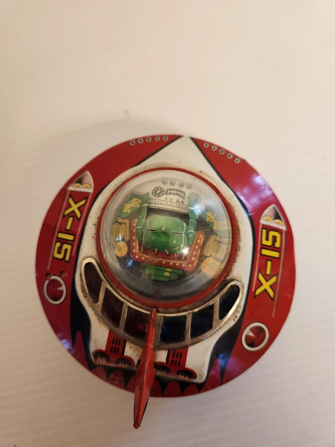 This is a vintage X-15 tin litho flying saucer toy. It features a clear dome with a green astronaut figure inside. The toy is primarily red and white with black accents and "X-15" . Wind-up toy with mechanisms on the bottom.