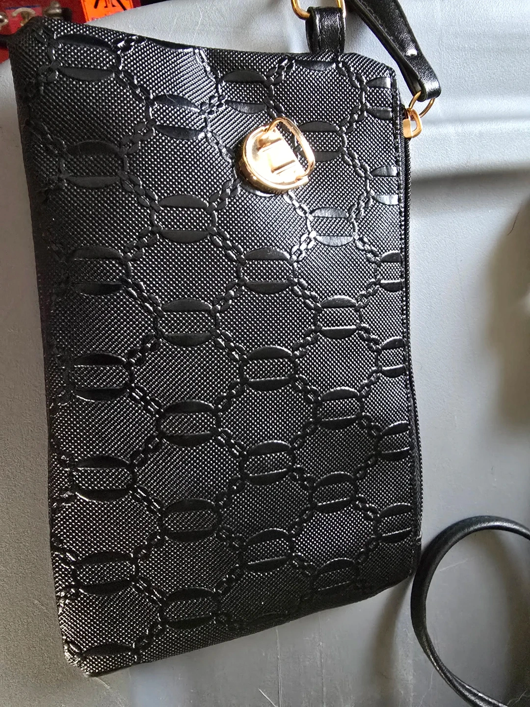 Black textured crossbody bag with gold accent