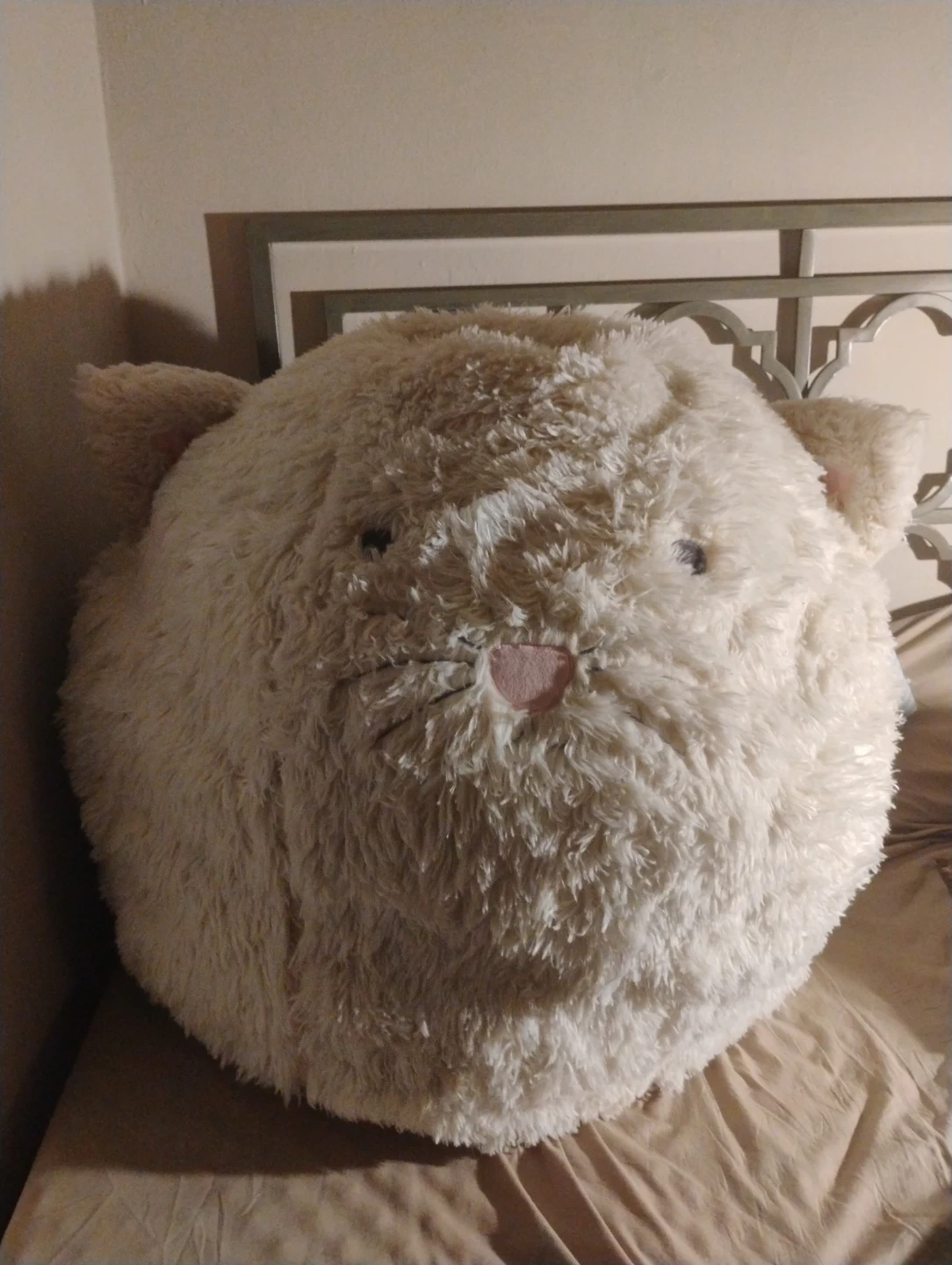 Super soft, oversized and over stuffed plush pillow designed as a cute cat. It's wonderfully fluffy and makes a great accent lounger for a toddler to tween. Perfect for cuddling! Cover has been washed with free and clear detergent. Open to offers. Approximately 28 inches tall and 93 inches around. Awesome but my daughter has grown up so she says it's not age appropriate anymore ☺️.