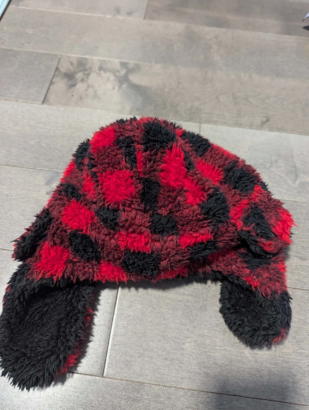 Cozy Gap Kids trapper hat in a red and black buffalo plaid pattern. It's made with a fuzzy shell and fleece lining for extra warmth. Size S/M, 52-54cm.