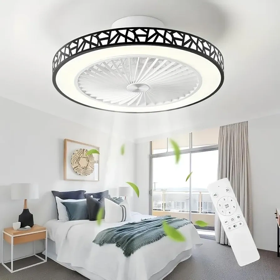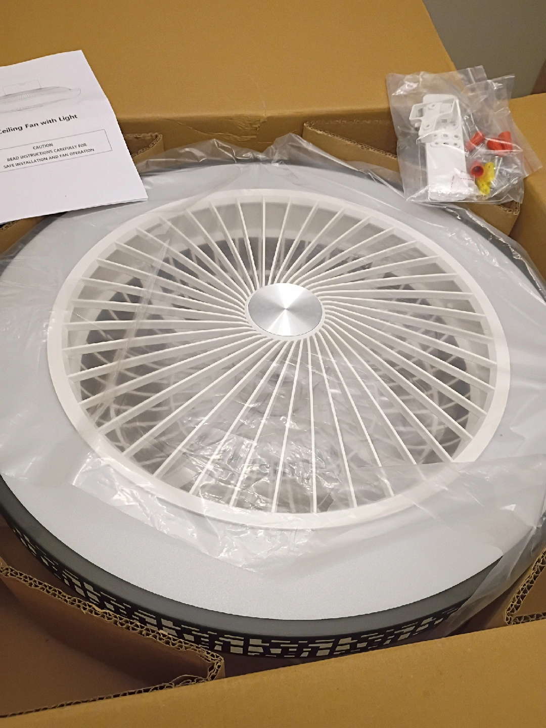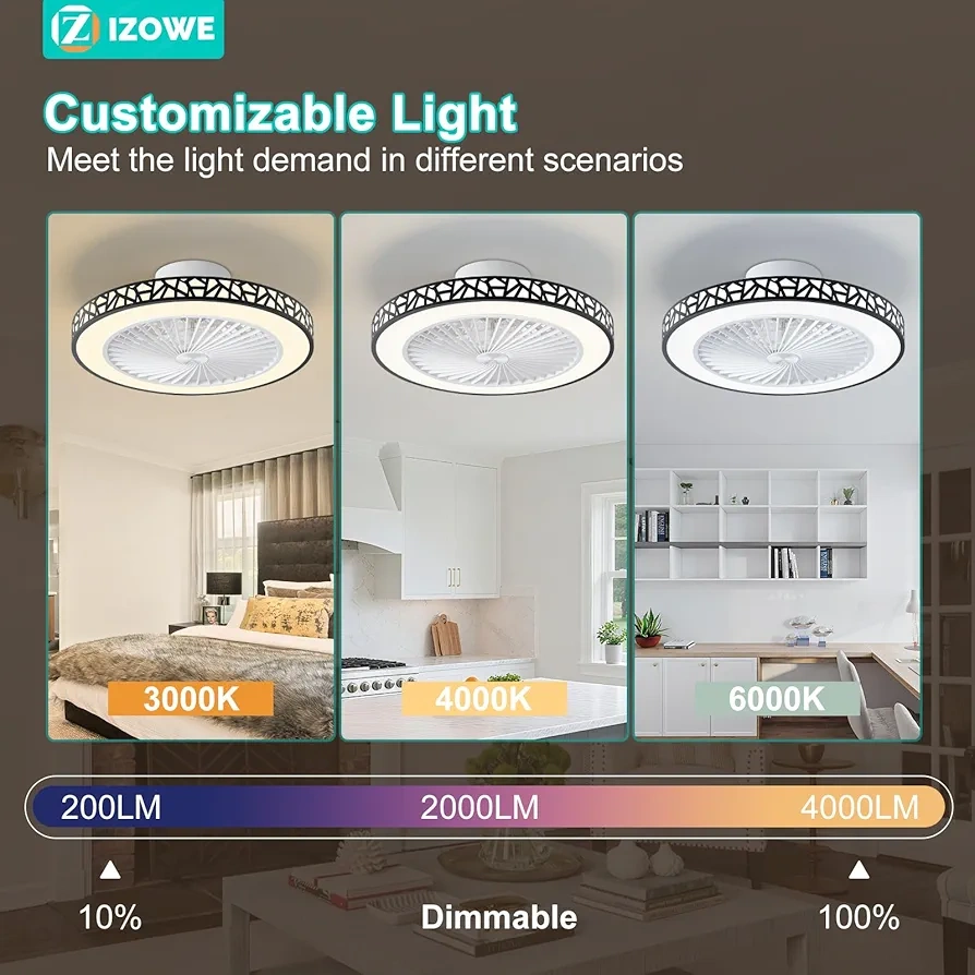This IZOWE ceiling fan with light is perfect for adding a touch of modern style to any room. It features a customizable light with adjustable brightness and colour temperature. Key features include: - 6-speed adjustable fan - Super quiet operation - 1/2/4H timer setting - Reversible DC motor The fan is 18.9 inches (48cm) in diameter and 5.9 inches (15cm) high. It also includes a remote control for easy operation and comes in the original box with all components Retail price $119, new, never uses, open box.
