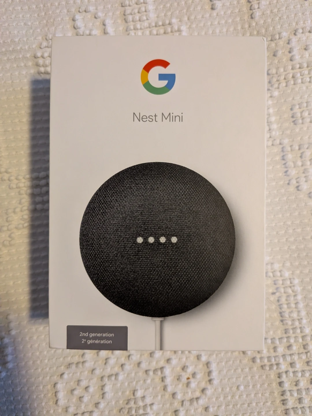 Google Nest Mini smart speaker in charcoal colour. It's the 2nd generation model and comes in its original box. This smart speaker helps with voice commands and playing music.