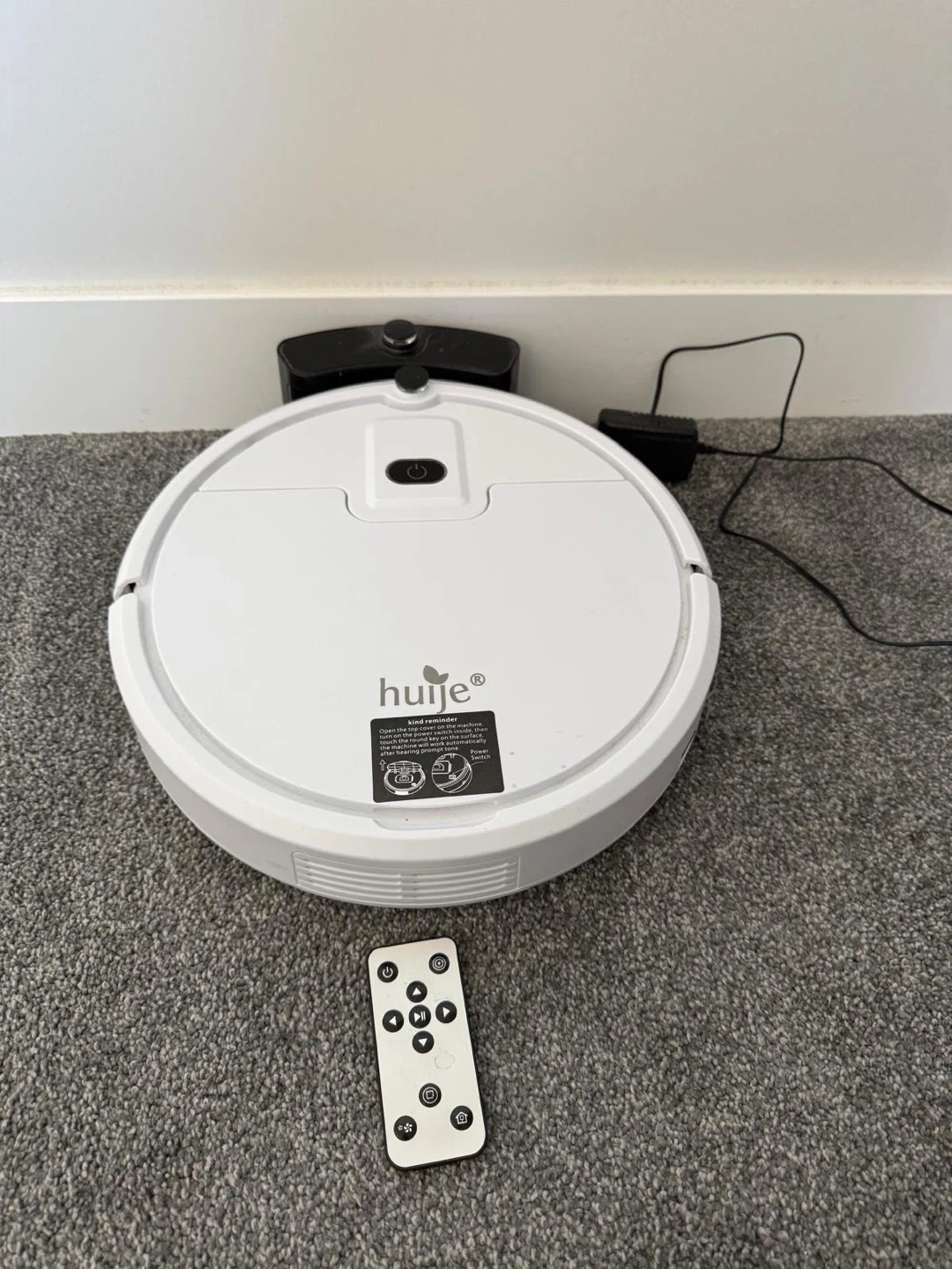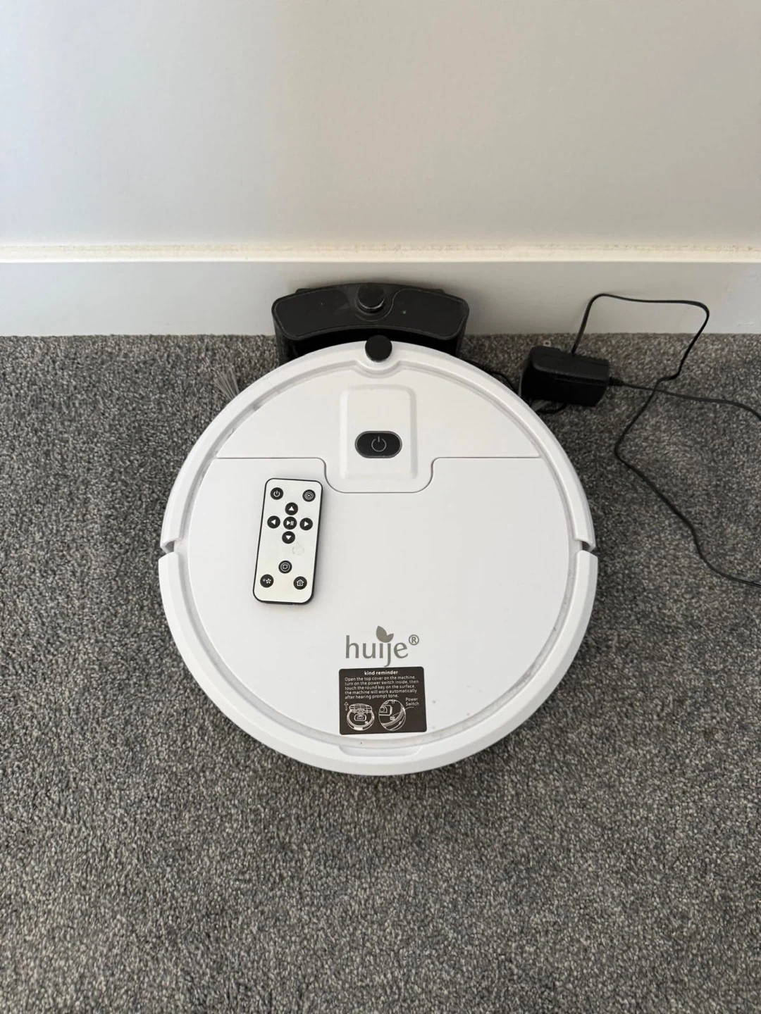 This white Huije robot vacuum cleaner comes with a remote control and charging dock. It's designed for automated floor cleaning. It features a dustbin for debris collection.