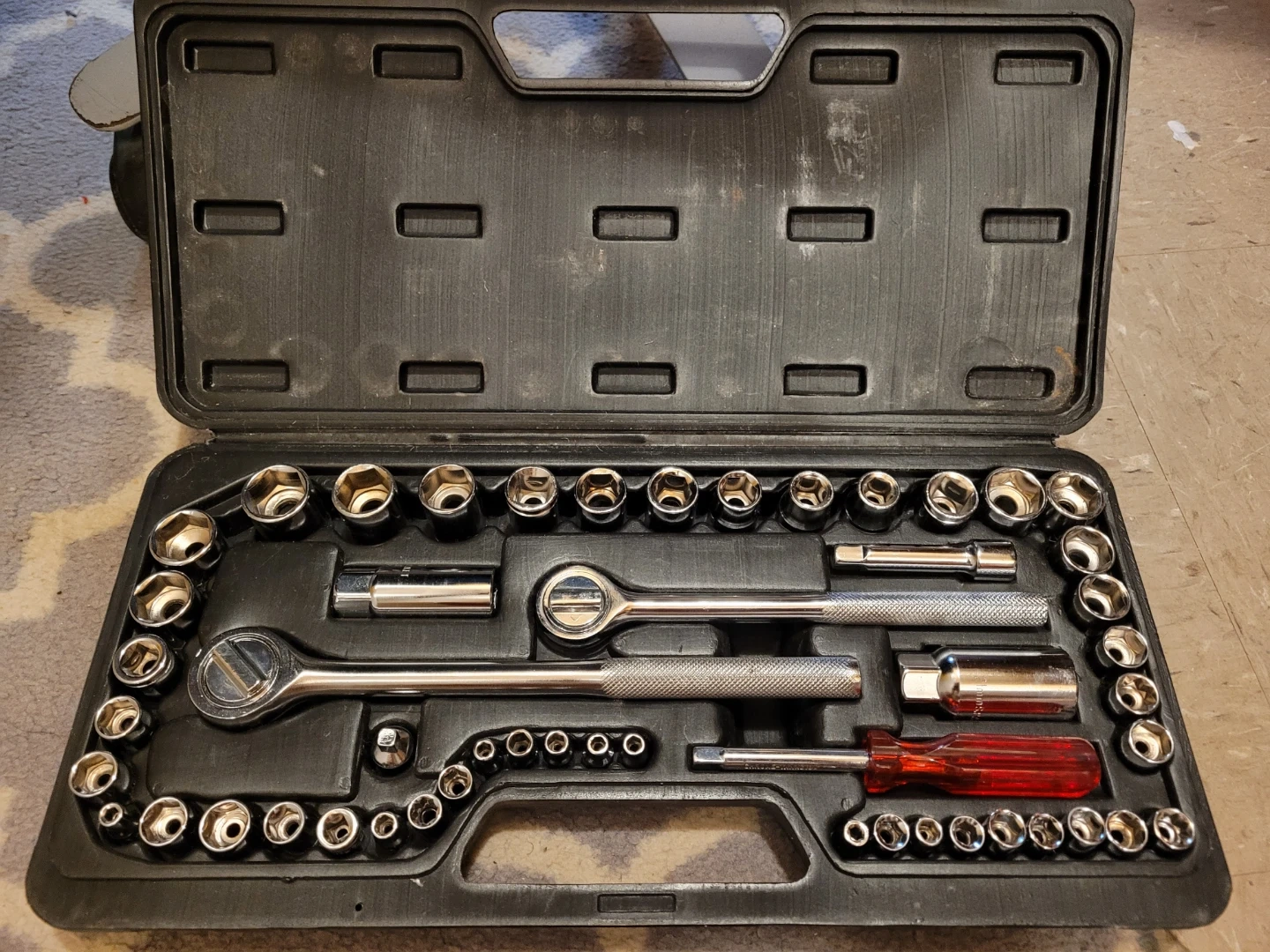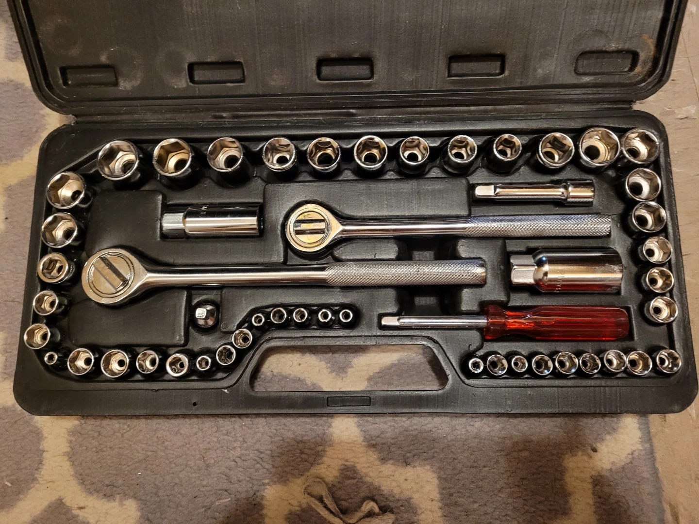 This is a socket wrench set in a black plastic case. It includes a ratchet, extension bars, and a variety of sockets. A red-handled screwdriver is also included. All pieces appear to be made of metal.