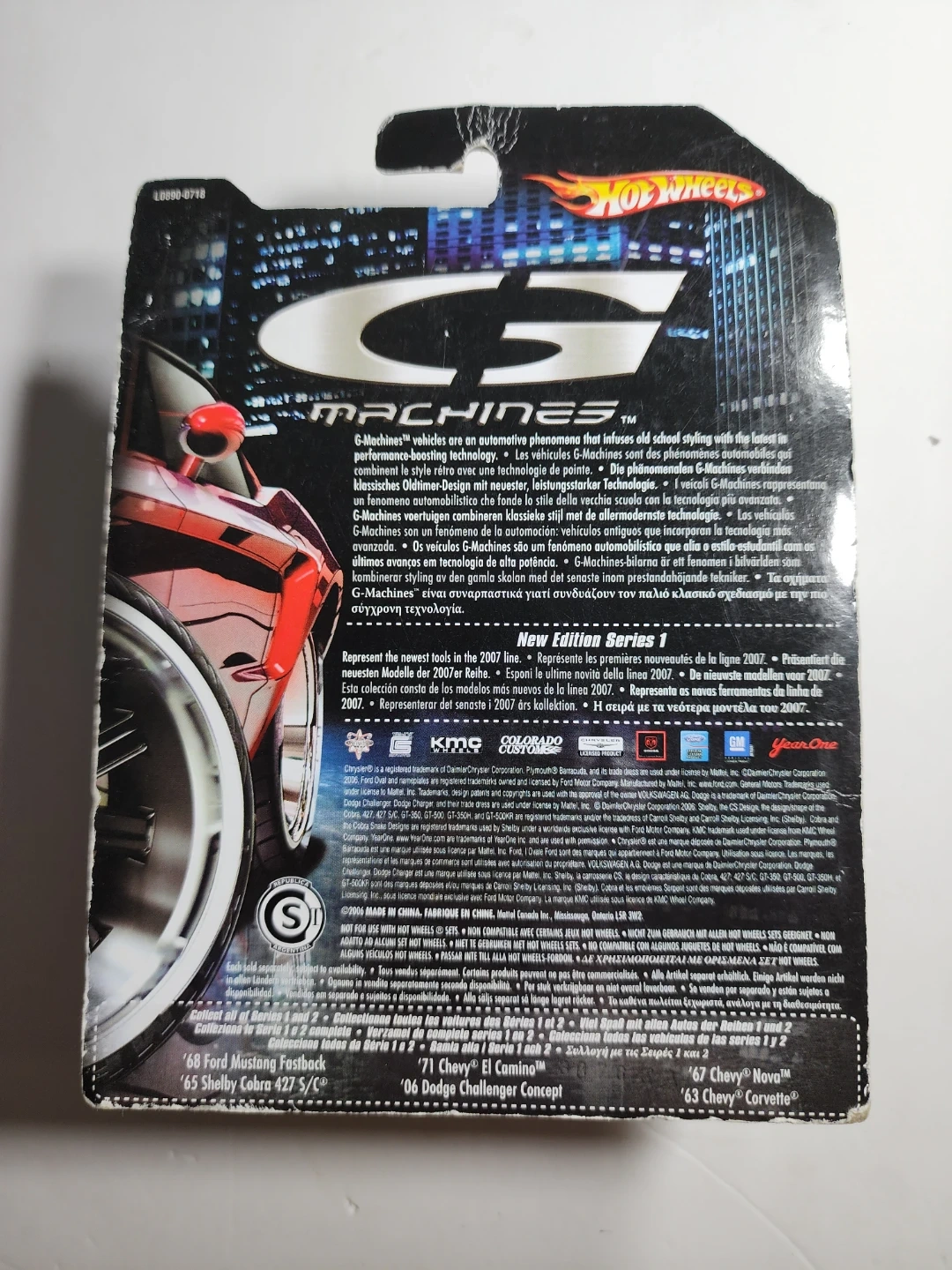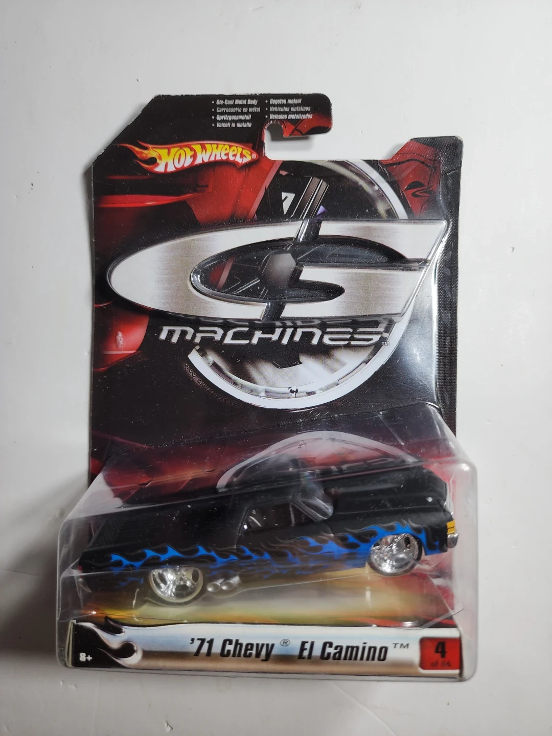 This is a Hot Wheels G-Machines '71 Chevy El Camino die-cast car. It's part of the 'New Edition Series 1' and features a black finish with blue flames. Constructed from die-cast metal.