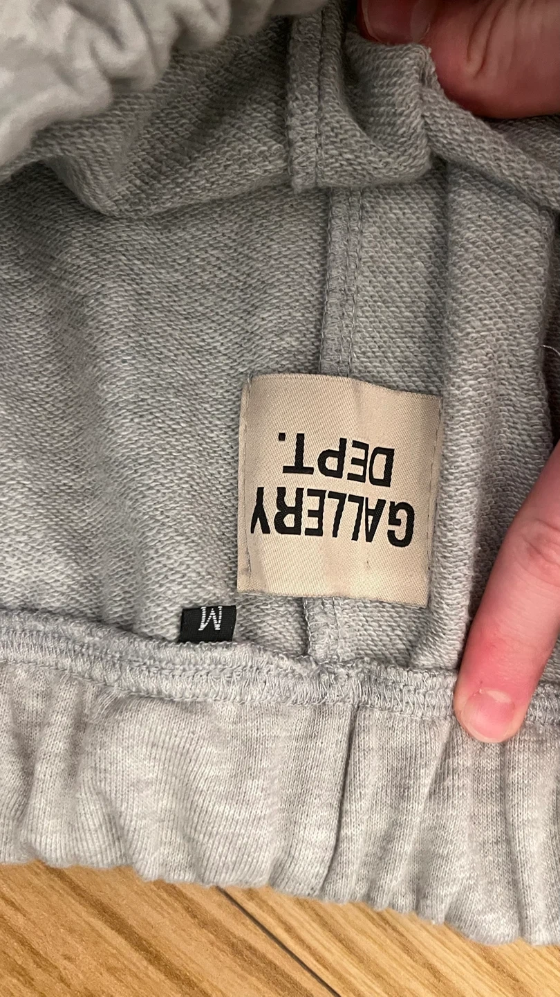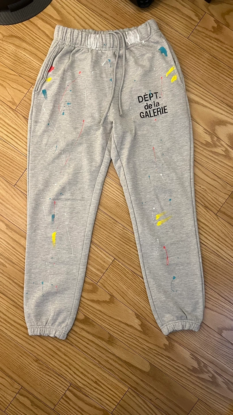Gallery Dept. sweatpants in grey with paint splatter detail. Size medium. Elastic waistband with drawstring. Ribbed cuffs.