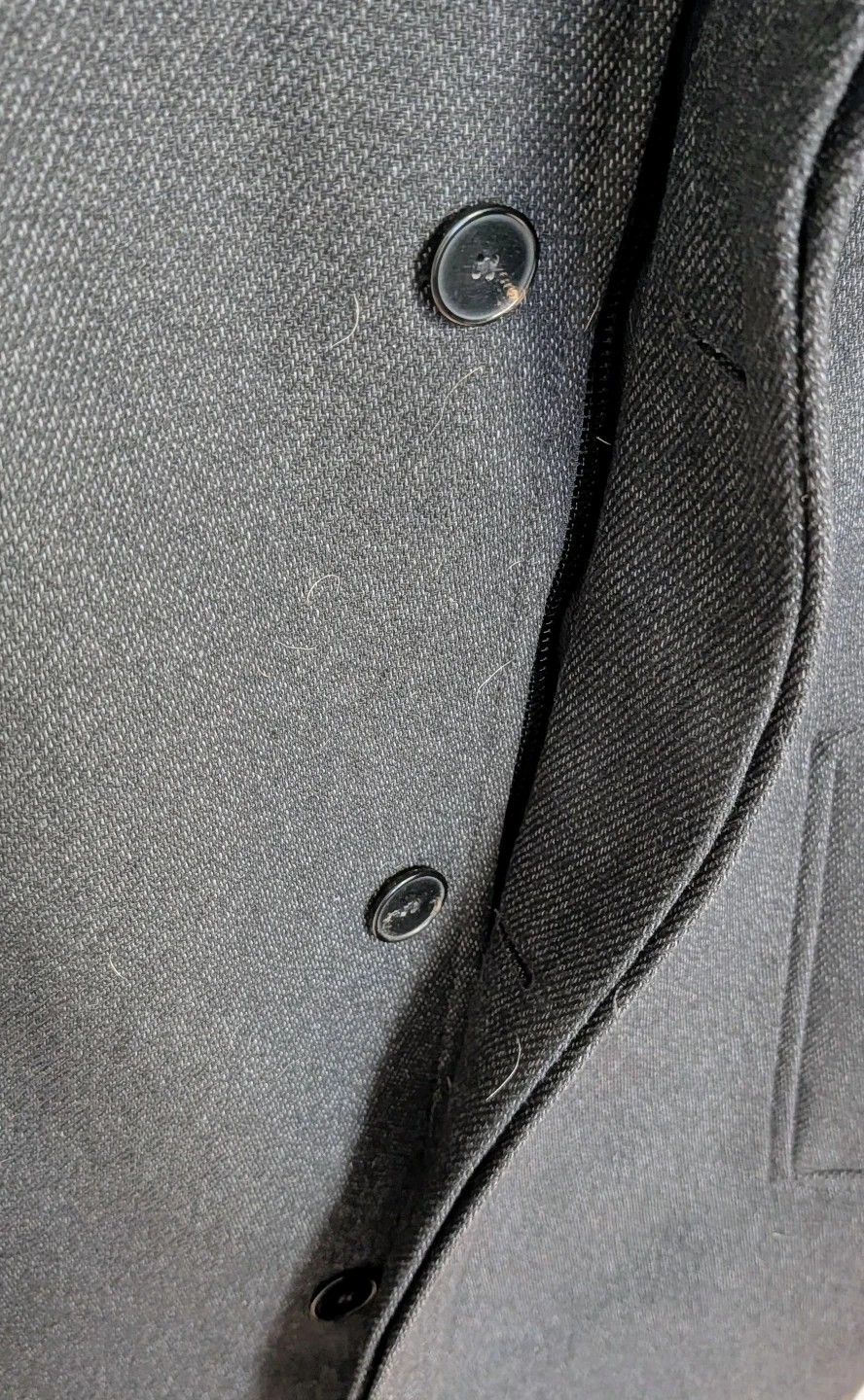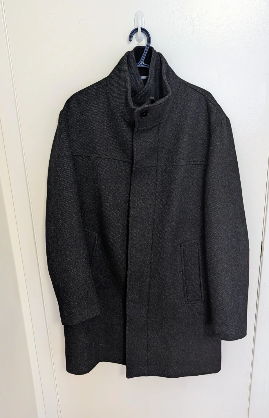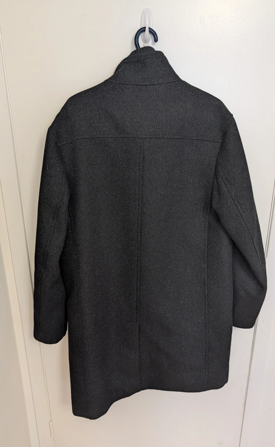 Dark grey peacoat jacket from Zara. It's made from a wool blend material. This jacket features a button-up front and a stand-up collar. Men's size Large (EUR L, USA L, MEX 42).