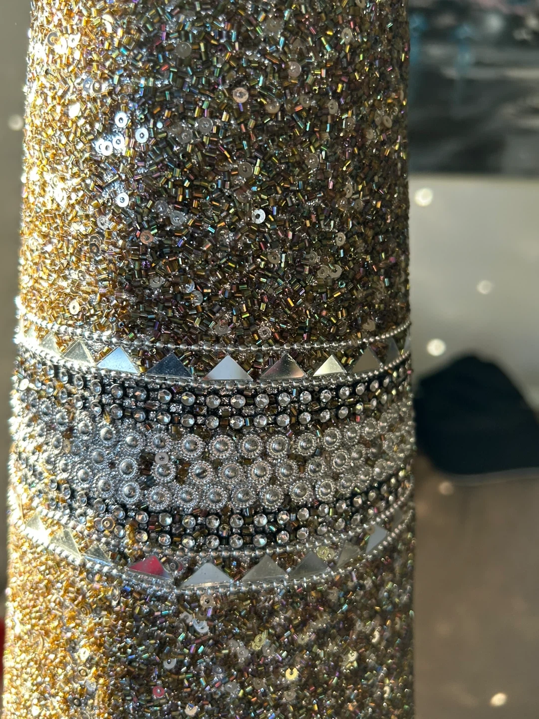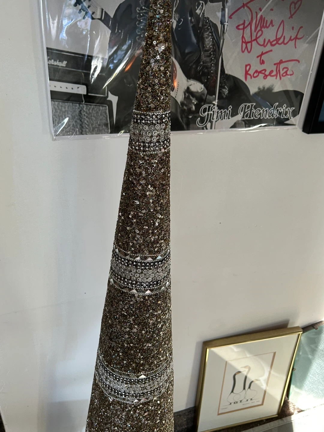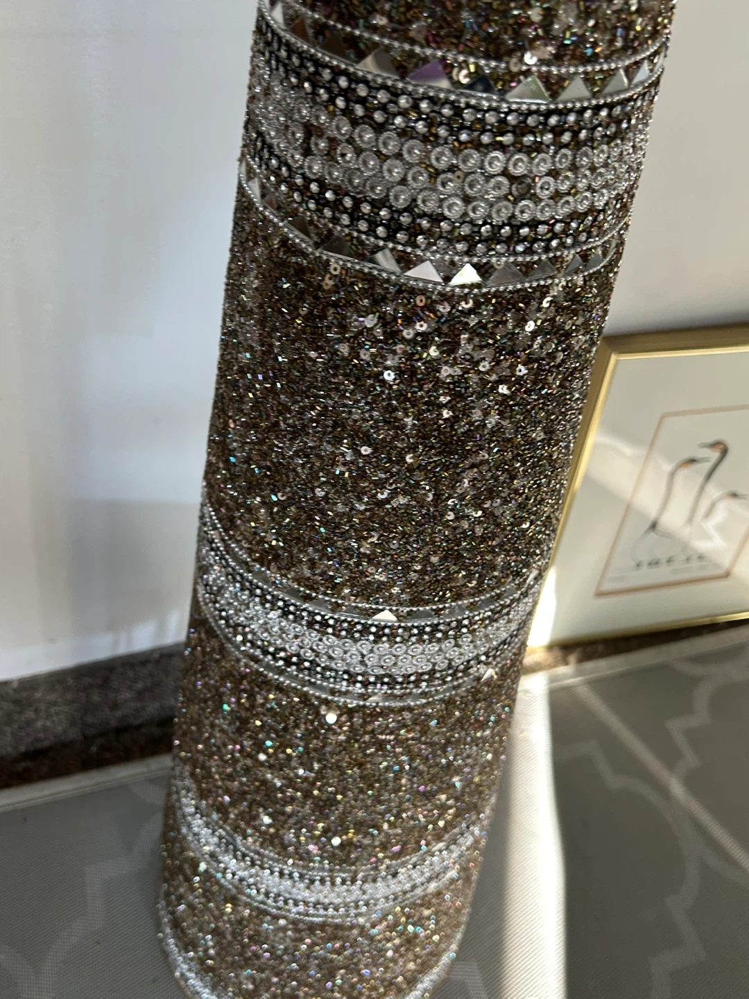 This eye-catching floor boasts a unique cone shape covered in shimmering beads and sequins. It features decorative bands of rhinestones and metallic trim. It's a striking piece that adds glamour to any room!